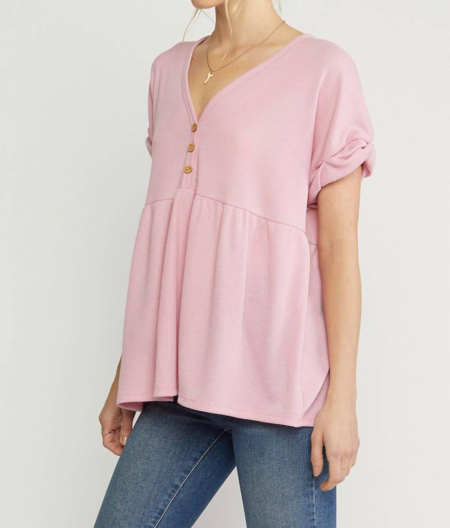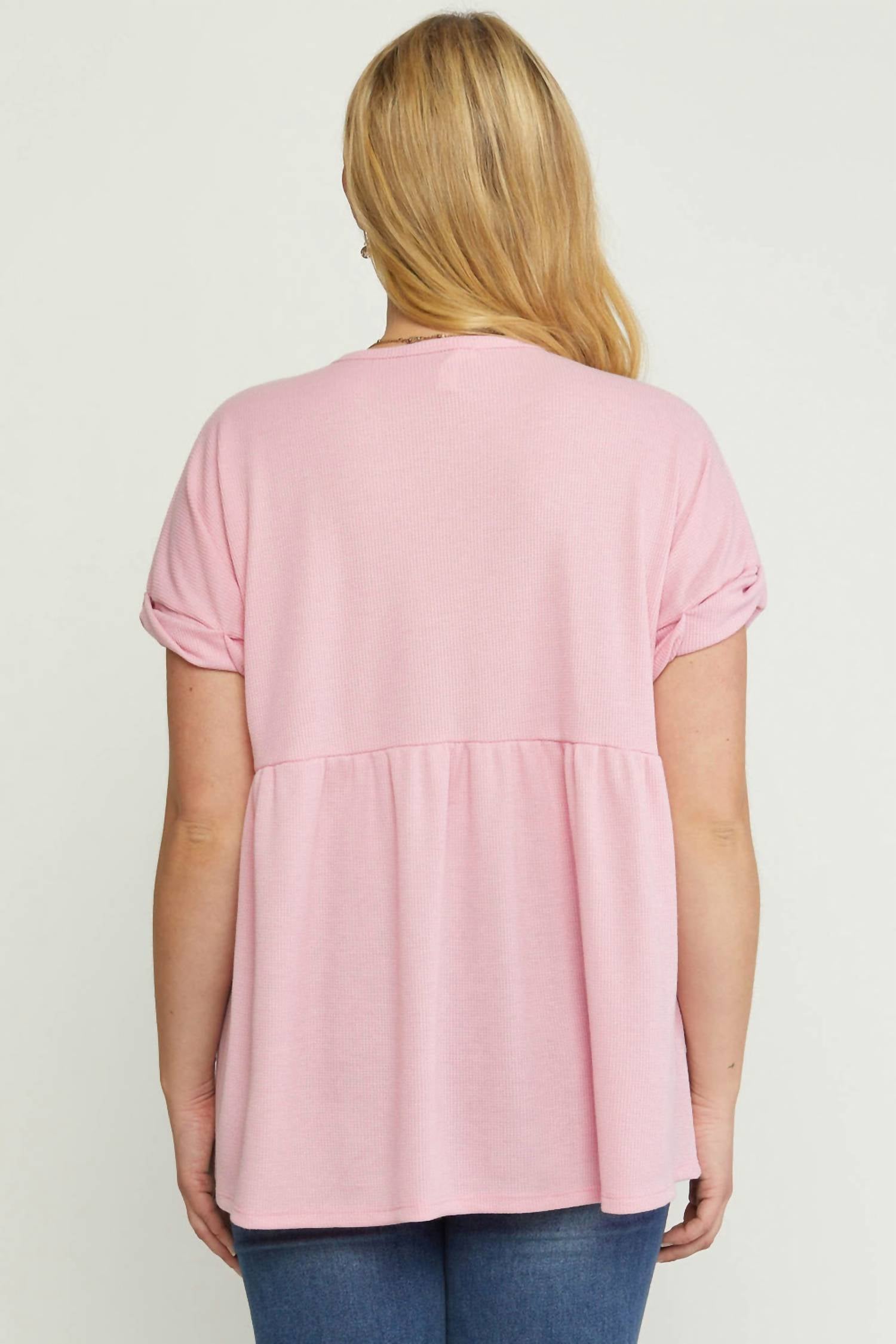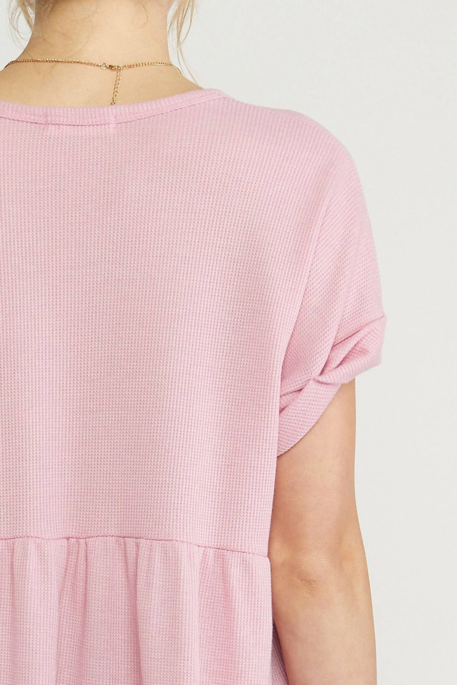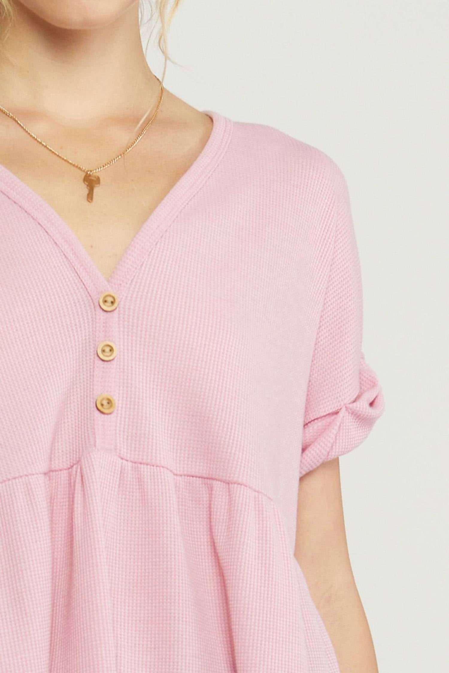 Pair this with your favorite jeans and slides for your next girls night out. It features a V-neckline with three buttons, short twisted sleeves, is made from a light weight mini waffle knit fabric and has a flattering a-line flowy oversized babydoll silhouette. Small: Bust 42" Length 28", Medium: Bust 44 Length 28". Large: Bust 46" Length 28", XL: Bust 52" Length 29". 1X: Bust 54" Length 29", 2X: Bust 56" Length 29". 85% Polyester, 10% Rayon, 5% Spandex. Soft stretchy fabric. Hand wash or dry clean. Made in the USA.