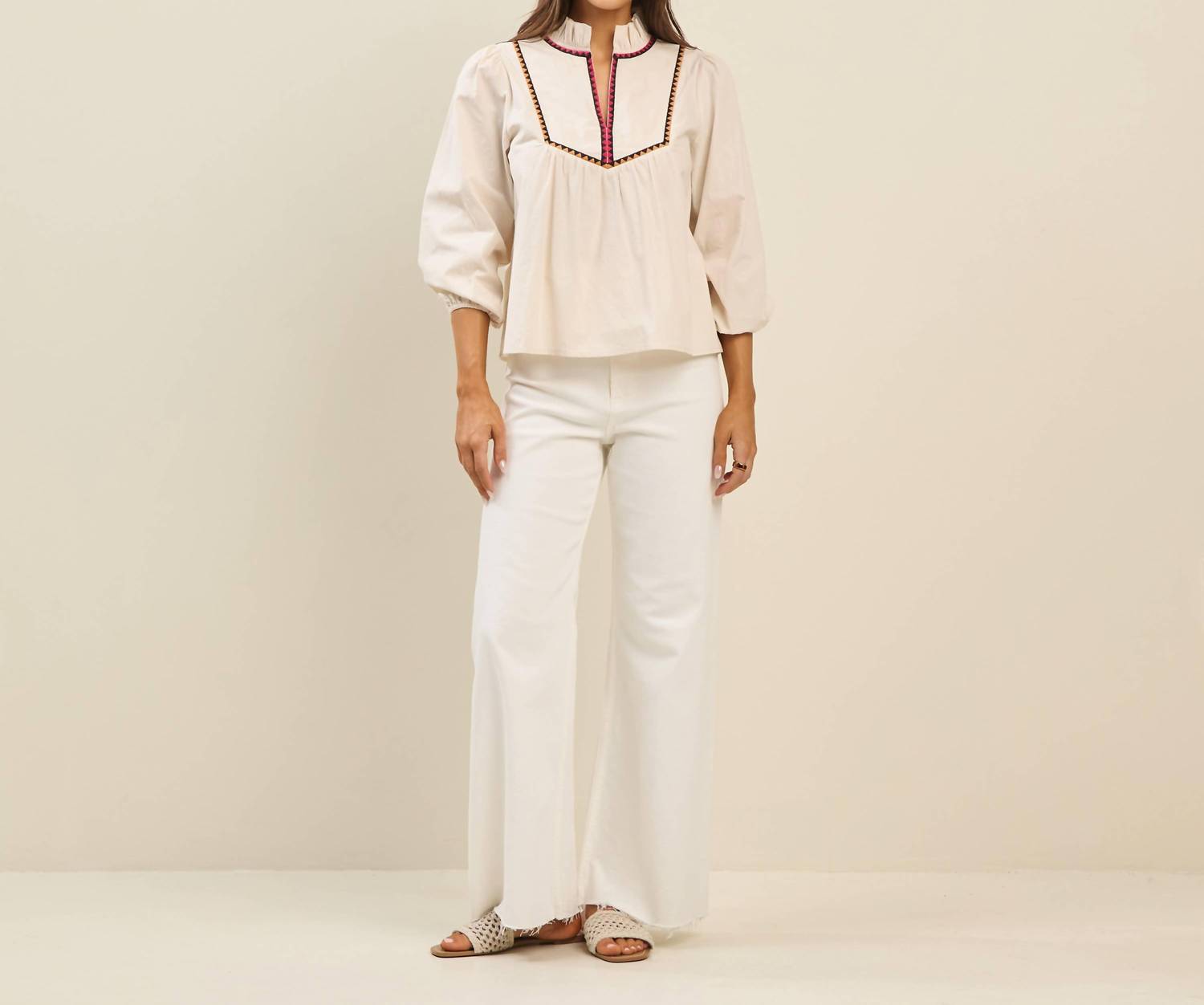 A versatile blouse that works from desk to dinner! Meet the Sophia Embroidered Top by ABLE, a stunning blend of artistry and elegance. This women’s blouse in ecru features a charming V-neck complemented by three-quarter sleeves, perfect for a holiday party. Crafted from quality cotton, its solid pattern and pull-on closure ensure both style and comfort. While washing and drying instructions are not specified, this blouse is an investment in timeless fashion versatility.