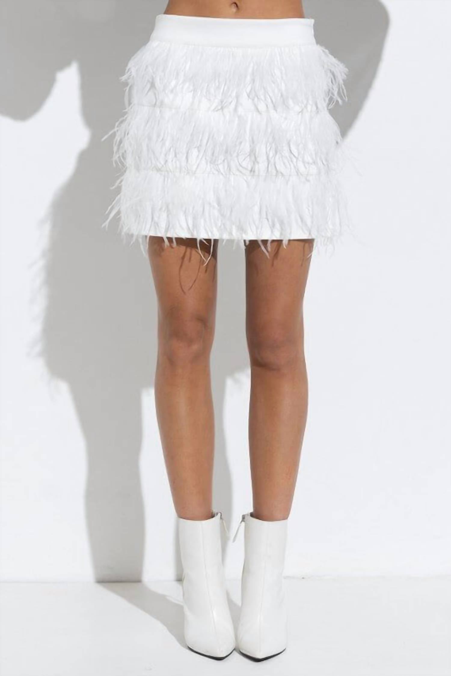 Turn heads with the Aria Tiered Feather Mini Skirt by Blue B, a textured white piece designed for maximum impact. This mini skirt features a unique layered feathers design crafted from 100% polyester with a suede ostrich fur effect. It secures comfortably with a side zipper and fits true to size. Perfect for music festivals or special summer occasions, care for it with machine wash. Available in sizes Small, Medium, and Large.
