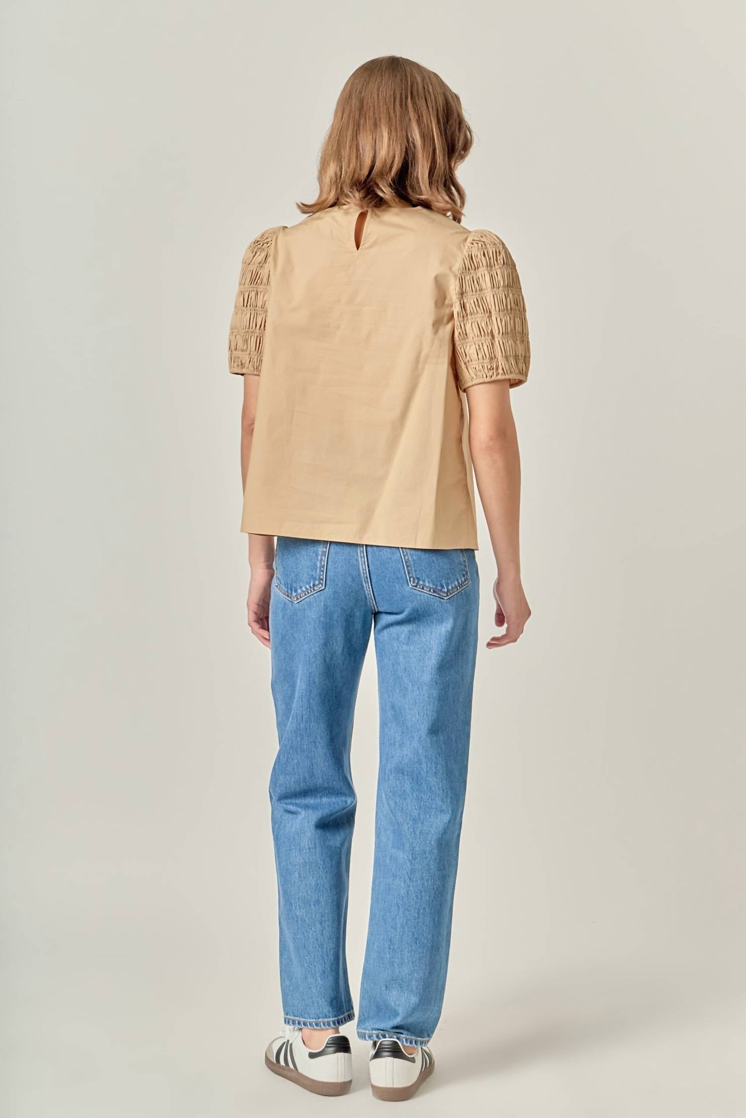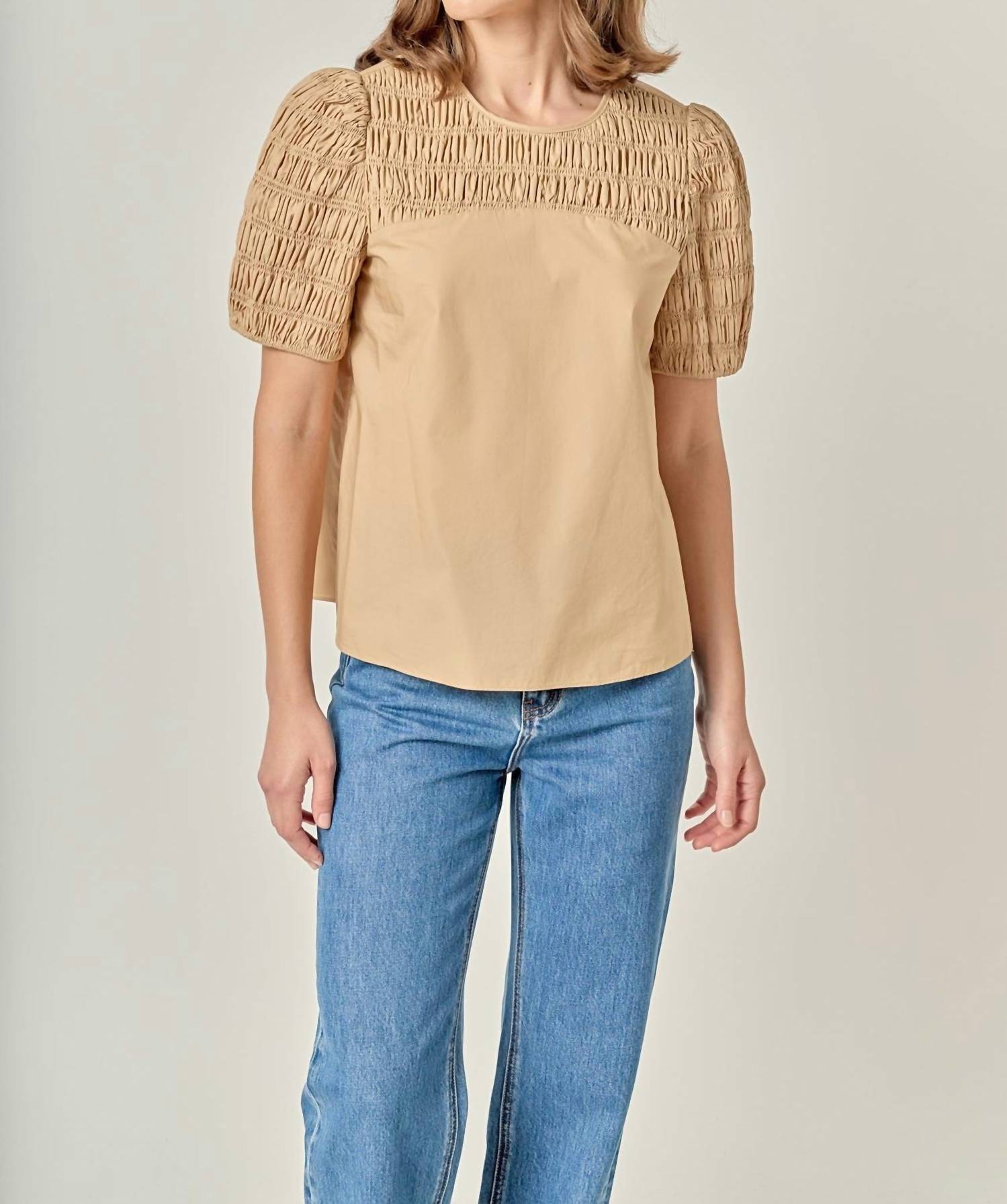 Pair this crop top with your favorite high-waisted jeans or maxi skirt. The English Factory Women's Smocked Top is an essential piece for your summer wardrobe, offering a boho chic vibe with its tan hue. It features charming puffy short sleeves with smocking and a bold front cut-out, along with a back keyhole for added flair. With a composition of 100% Cotton for the shell and a lining of 80% Polyester and 20% Cotton, it promises comfort and style. Care instructions include hand washing cold, avoiding bleach, and low ironing to maintain its elegant design. Total length for size small is 24" and bust is 38". Ideal for vacation wear, this crop top is sure to turn heads.