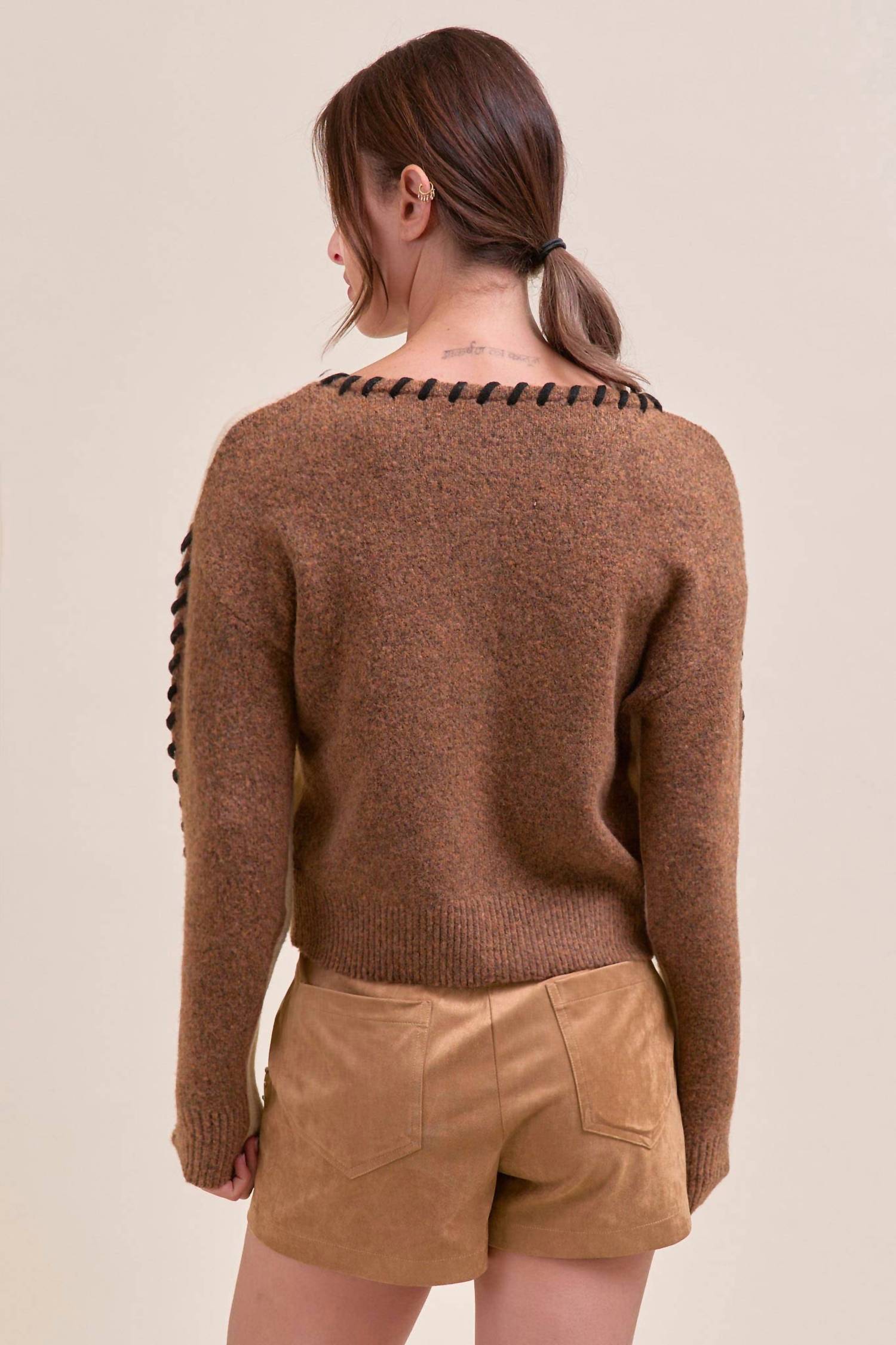 Elevate your holiday party wardrobe with the Whip Stitch Two-tone Sweater by &merci, tailored for a modern, versatile look. This cozy knit features long sleeves with a relaxed drop shoulder and a stylish crewneck, adorned with contrasting whip stitch details. This solid taupe brown sweater is designed for spring, offering easy pull-on convenience. Perfect for creating a high-quality ensemble, pair this with your favorite bottoms for effortless style.