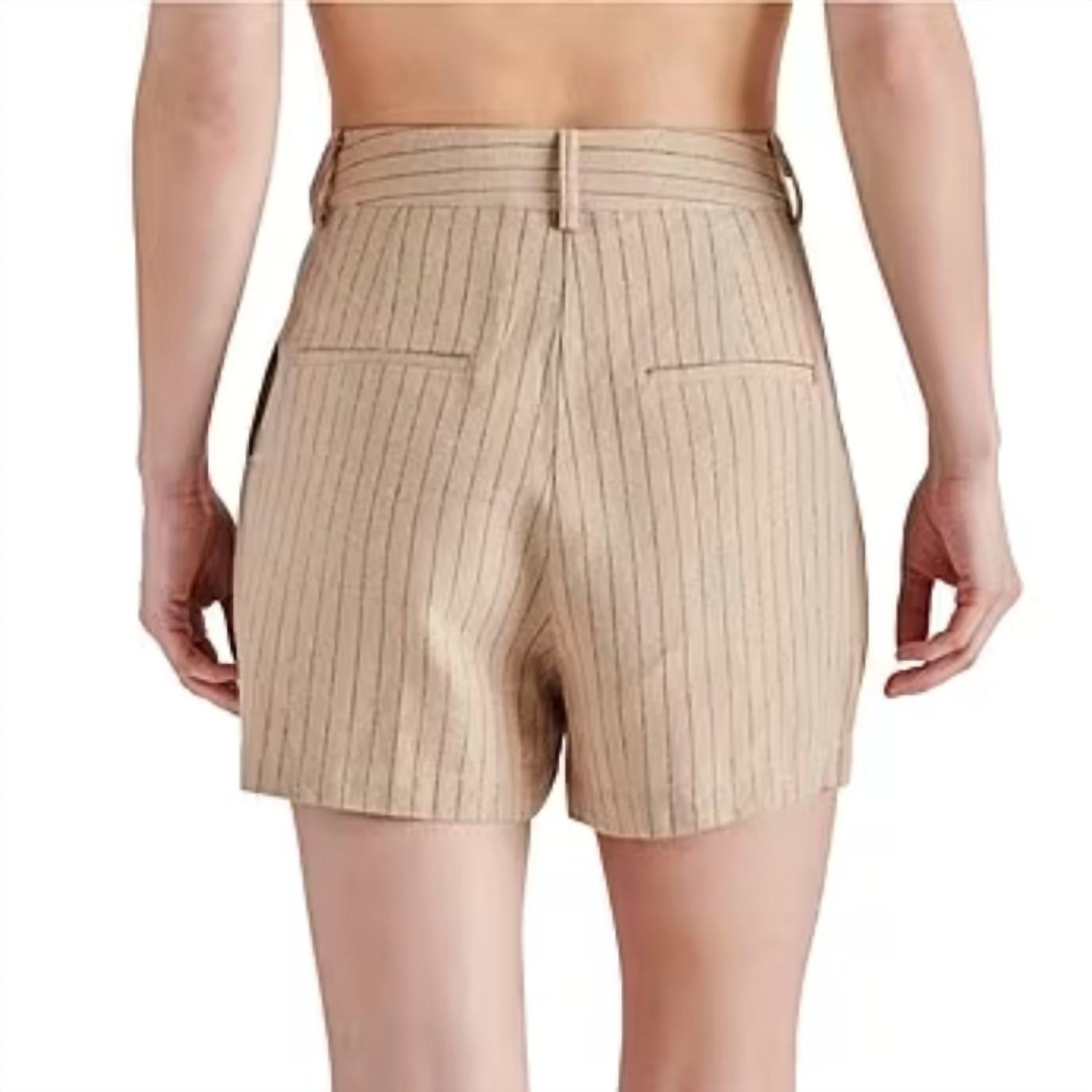 Tuck your favorite tee into these high-waist shorts for a more casual-cool feel. Introducing the Imelda Shorts by Steve Madden, a chic addition to any spring wardrobe in a striking Wood Thrush color. These high waist shorts feature a timeless pinstripe pattern and are crafted from a comfortable linen blend. Designed with practicality in mind, they come with pockets and a stylish button closure. For care, hand wash and line dry to maintain their minimalist elegance.
