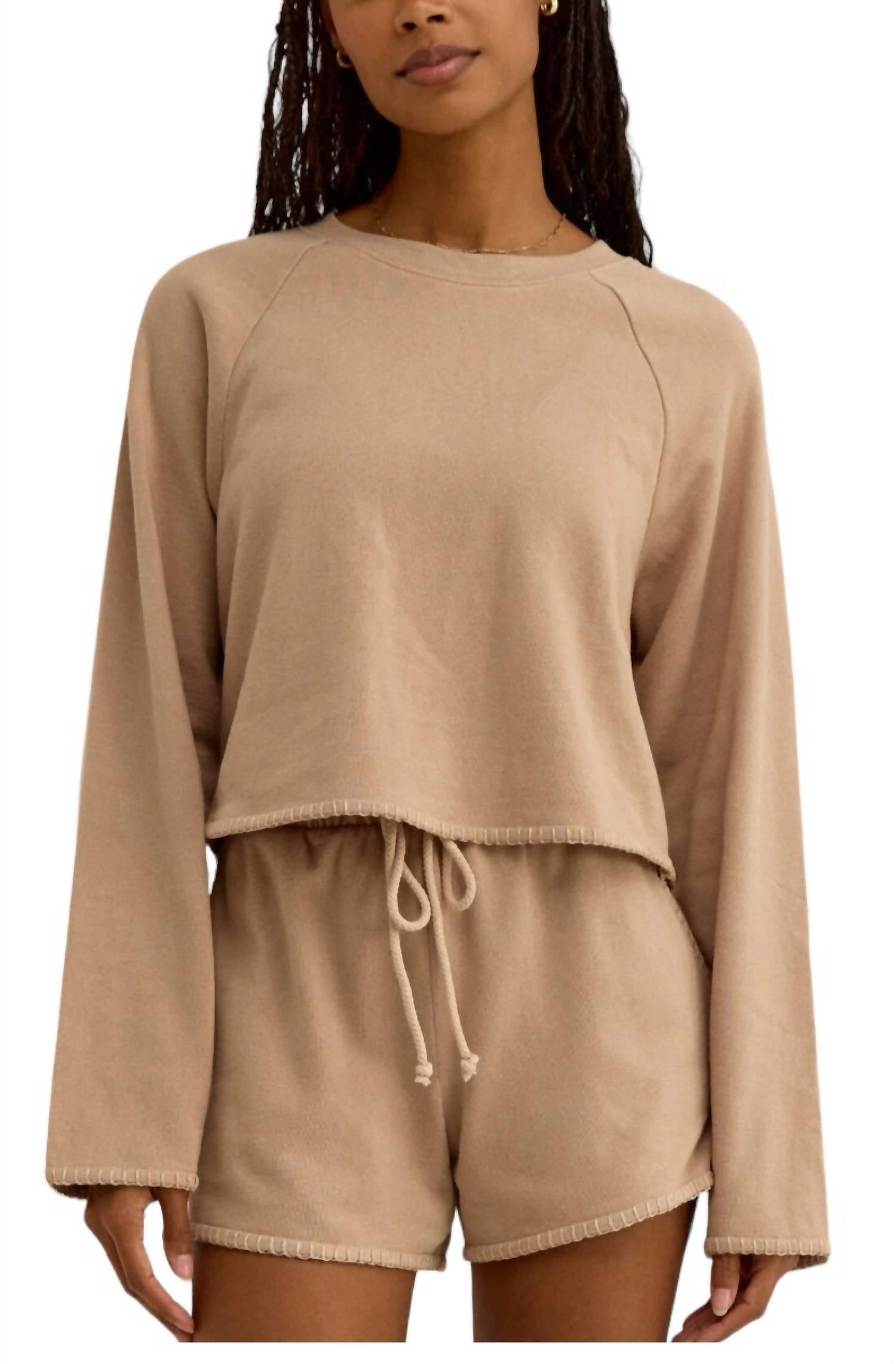 Cooler temps call for layering and we love this adorable sweatshirt for all the obvious reasons. The contrast stitch detail at the hem adds a unique touch, while the 100% cotton French Terry fabric provides ultimate softness. Length from shoulder is 18.5 inches. Fit: True to size, cropped style, but not super short. Fabric: 100% cotton.