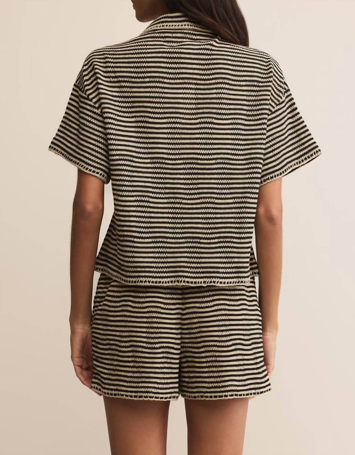 Introducing the Monaco Button Up Shirt by Z Supply, a perfect addition for your beach days. This stylish black shirt features short sleeves and a collared neckline, adding a chic touch to your outfit. Crafted from a soft cotton blend (54% cotton, 46% polyester) with textured tapestry stripes, it assures both comfort and fashion. Functional buttons run down the front for easy wear, and it requires a cold machine wash and line drying to maintain its quality. Model is wearing a medium size and the shirt fits true to size, though it's recommended to size up if you're between sizes.