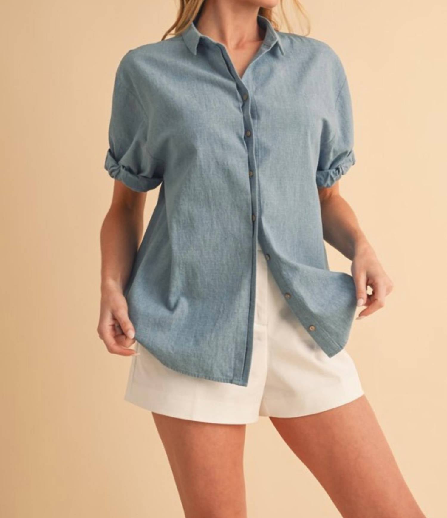 Perfectly tailored and soft to the touch. The Raelee Button Down Collared Shirt by AEMI + CO is a quintessential piece for those seeking a blend of feminine style and casual ease. Made from a cotton blend composed of 80% Cotton and 20% Polyester, this shirt is lightweight and features short puff sleeves with elastic cuffs for added flair. The button closure complements its classic collar, making it ideal for pairing with shorts or leggings. Offered in a solid light denim, it's the perfect addition for a dinner party or simply showcasing a nod to 90s fashion.