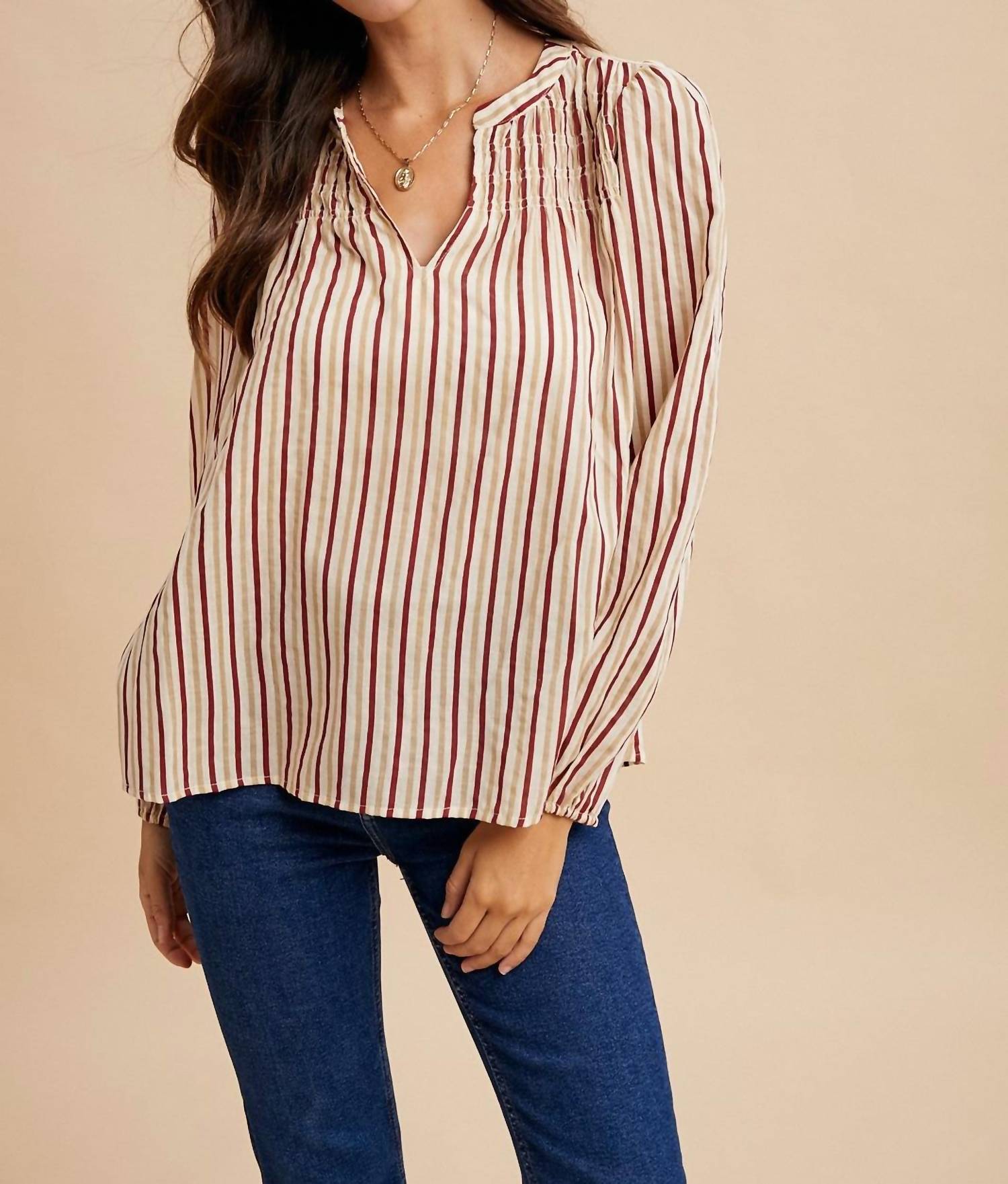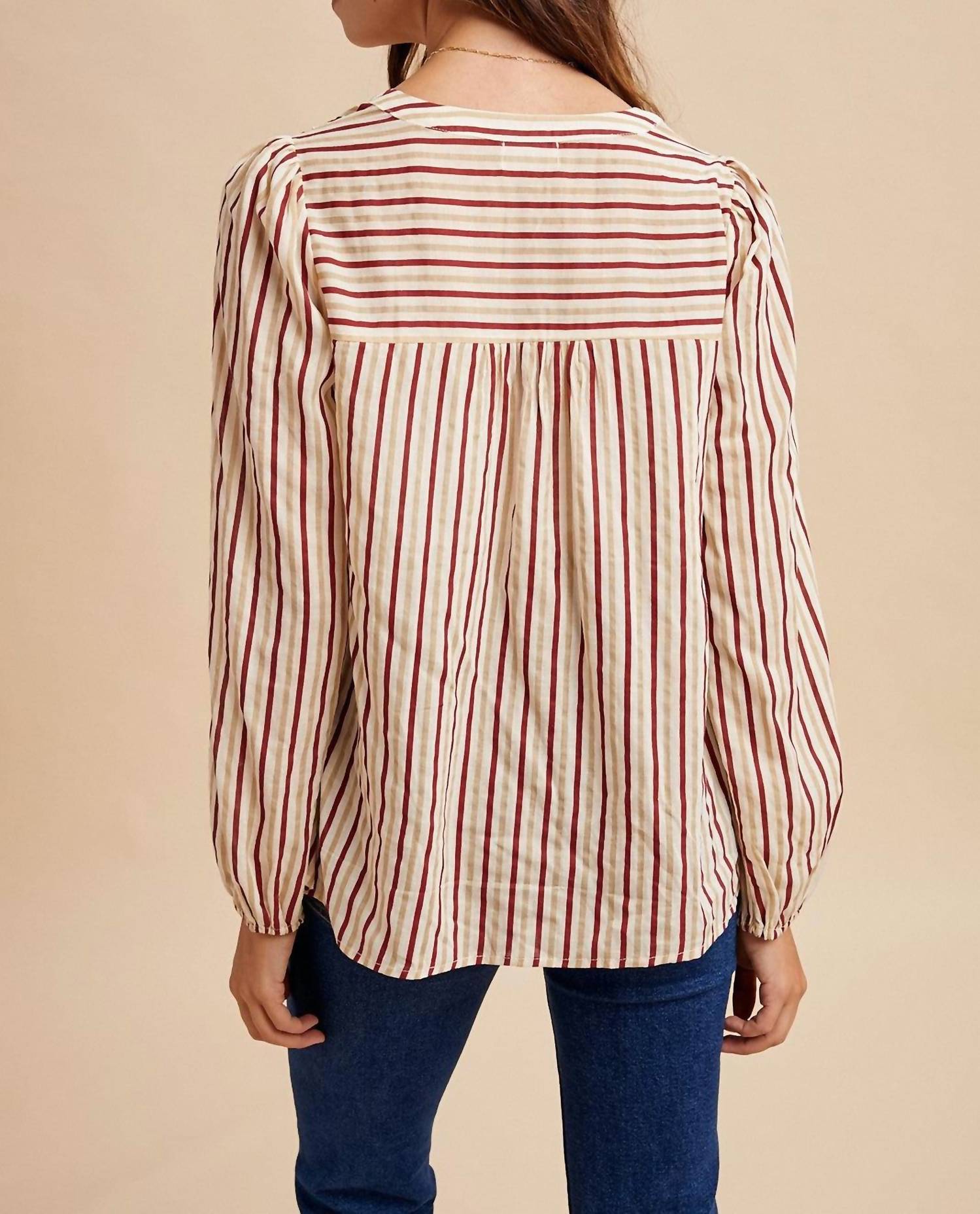 Pair this with your favorite jeans and slides for your next girls night out. Elevate your wardrobe with the Notch Neck Striped Blouse by AnnieWear, a perfect addition to your workwear collection. This multi-color stripe blouse features long puff sleeves and a notched V-neck, offering a loose fit for comfort and style. Crafted from 80% rayon and 20% polyester, this versatile piece comes with a pull-on closure. Care instructions include machine wash and line dry, making it an easy choice for your daily rotation.