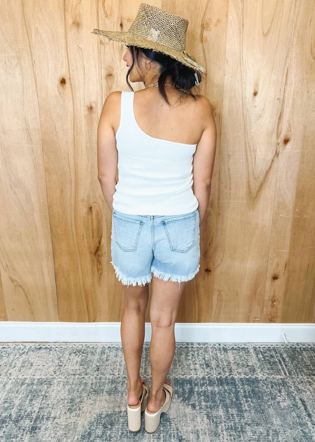 The perfect tank top for those warmer weather seasons. The Women's Jaime Ribbed Shoulder Tank Top by Another Love is a chic addition to your spring wardrobe. Featuring a sleeveless, off-the-shoulder design, this white tank boasts a solid ribbed texture that adds both depth and style. Its pull-on closure makes it an easy choice for a boho-chic look during vacations or casual outings. Care instructions are not specified, so treat this piece with gentle care for lasting wear.