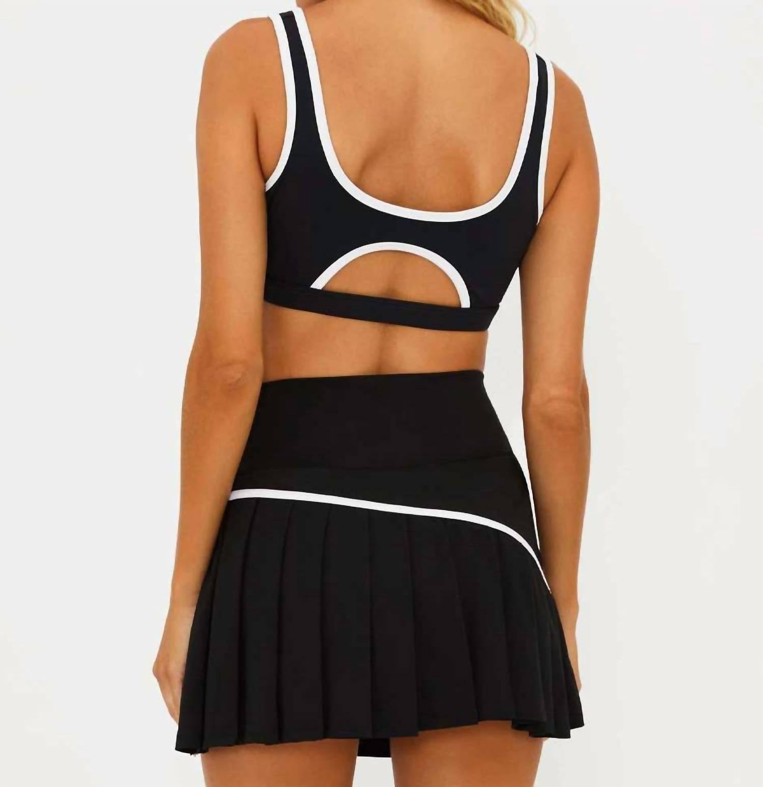 A sports bra that has it all - style, function and support. Introducing the Olympia Sports Bra Top by Beach Riot, engineered for both style and performance in a striking black and white colorblock pattern. This women's sports bra is crafted from a super-soft, four-way stretch fabric composed of 78% polyester and 22% spandex, ensuring ease of movement through medium-intensity workouts. Its design features white piping around the hems and cups, coupled with an open back cutout for added flair. Ideal for those seeking a blend of fashion and function, without the fuss of special care instructions.