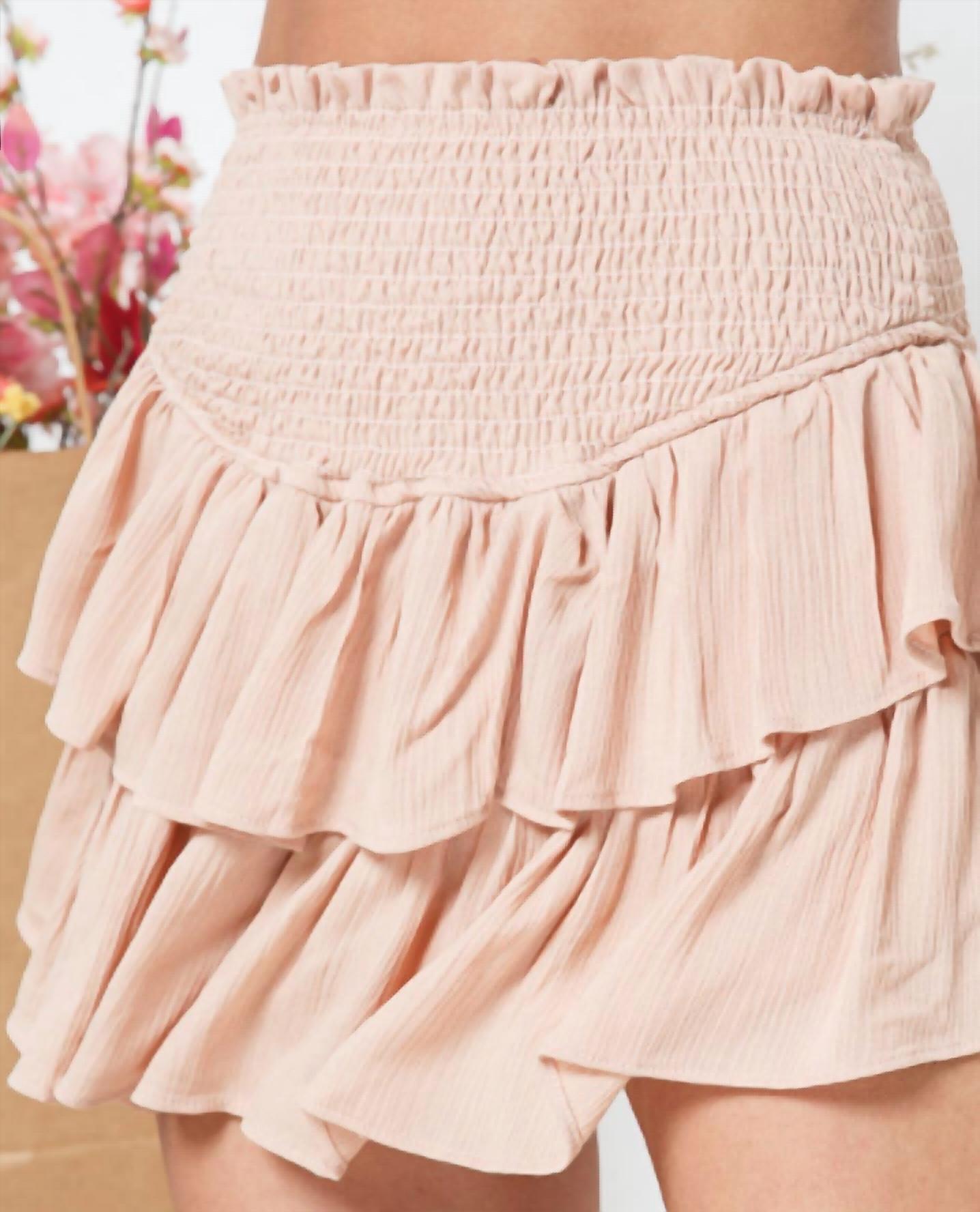 The cutest skort that combines style and functionality. Elevate your wardrobe with the Women's Ruffle Smocked Mini Skort by Blue B, an embodiment of playful elegance in a chic beige hue. This textured skort is expertly designed for women, combining the flirty appeal of a mini skirt with the practicality of shorts, perfect for a cocktail party. The ruffled detail adds dynamic flair, while the smocked waistband guarantees comfort and a flattering, snug fit. This piece is testament to Blue B's dedication to crafting garments that merge style with functionality.