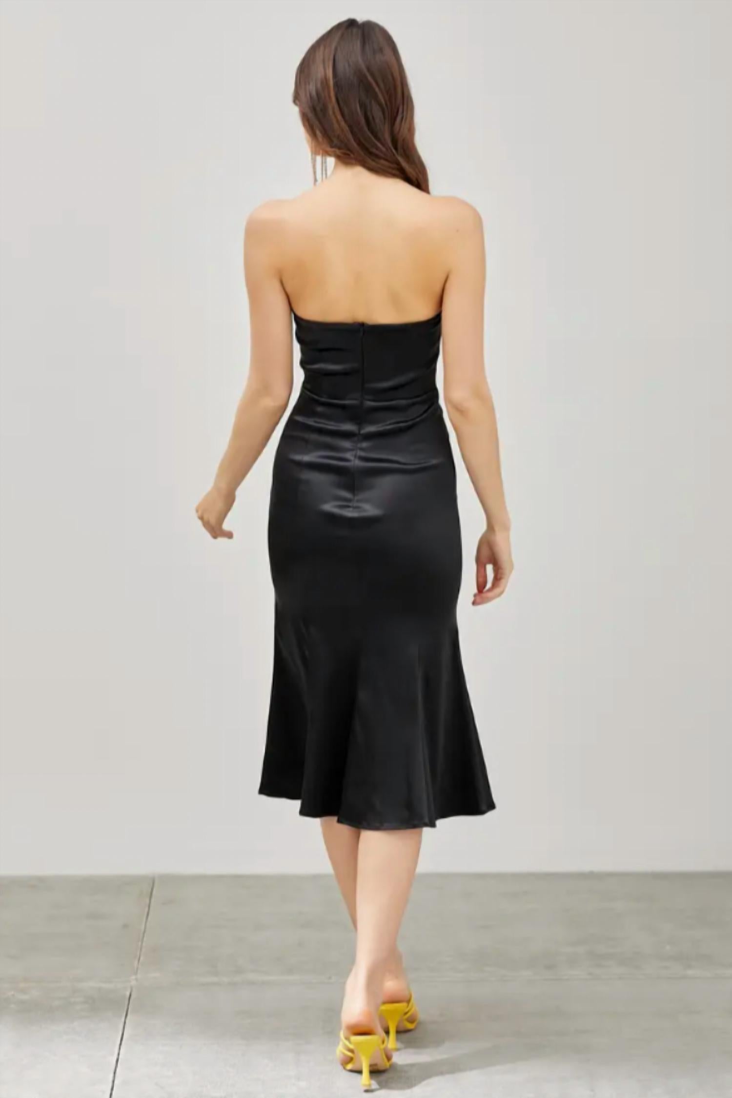 The perfect length dress does exist. Introducing the Tube Trumpet Midi Dress by DO+BE in a classic hue, designed for a flattering fit with its elegant sheath silhouette. This strapless, off-the-shoulder dress is expertly crafted from 95% Polyester and 5% Spandex, offering comfort and breathability. The midi length and stylish trumpet shape make it versatile for any occasion. Closure: Zip closure. The model is 5'9" with measurements of 32-24-34 and is wearing size S.