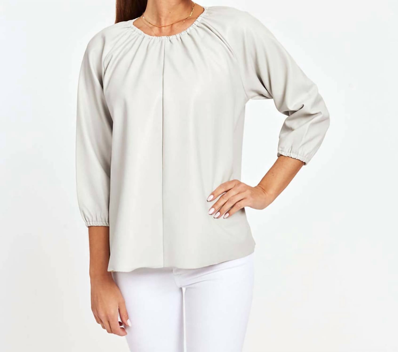 A timeless blouse that will never go out of style. Dolce Cabo vegan leather three-quarter sleeve top with gathered neckline. Soft material for ease and comfort. Suitable for any weather. Three-quarter exaggerated puff relaxed sleeve. Relaxed fit. Lightweight vegan leather. Wipe with a damp cloth. Sizing: true to size; the model is 5'11" and is wearing size S.