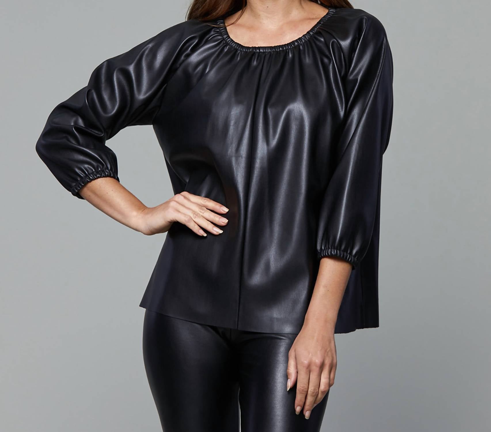 A timeless blouse that will never go out of style. Dolce Cabo vegan leather three-quarter sleeve top with gathered neckline. Soft material for ease and comfort. Suitable for any weather. Three-quarter exaggerated puff relaxed sleeve. Relaxed fit. Lightweight vegan leather. Wipe with a damp cloth. Sizing: true to size; the model is 5'11" and is wearing size S.