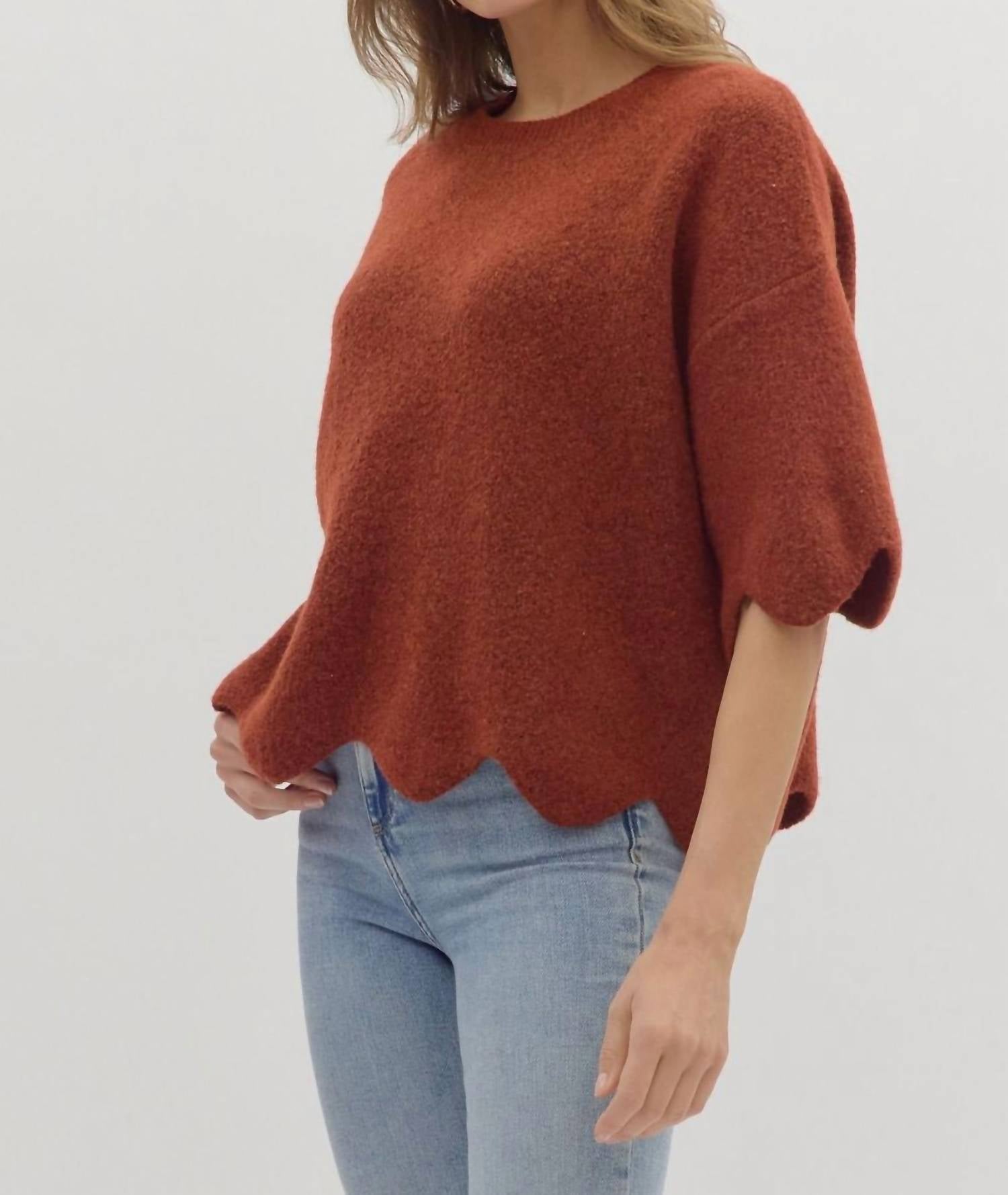 The ultimate go-to sweater, expertly crafted to provide the perfect combination of warmth and style. Its classic design and soft fabric make it a must-have addition to your wardrobe. Elevate your fall wardrobe with the Scallop Hem Knit Relaxed Sweater by Entro, crafted in a solid rust color for versatile styling. This women's pullover top features short sleeves and a relaxed fit, finished with a charming scallop hem. Designed with a crewneck and made for workwear chic, it offers easy wearability with a pull-on closure. Care for this lightweight, unlined piece is simple: machine wash when needed.