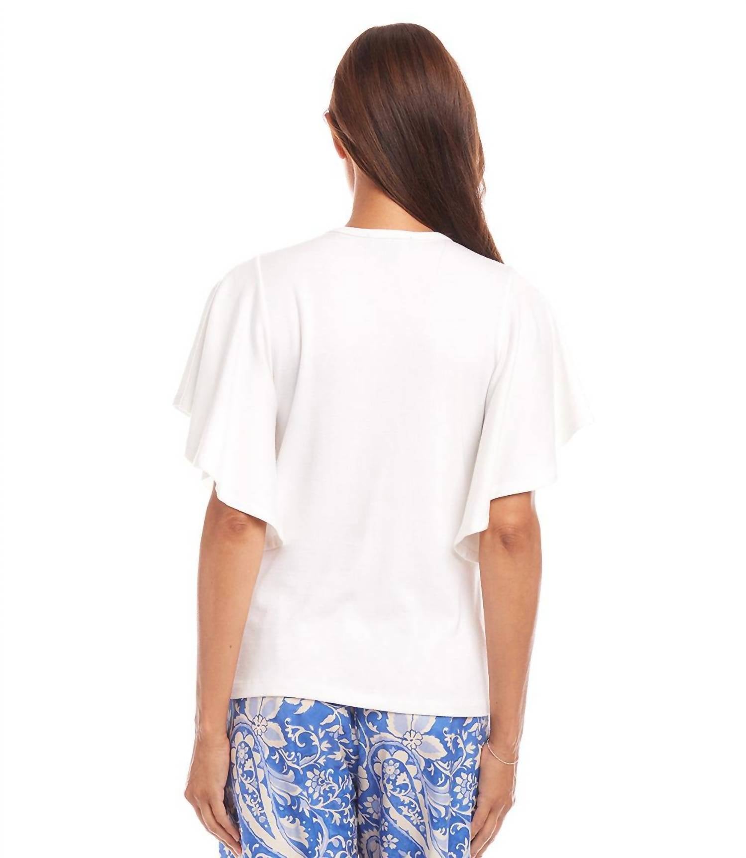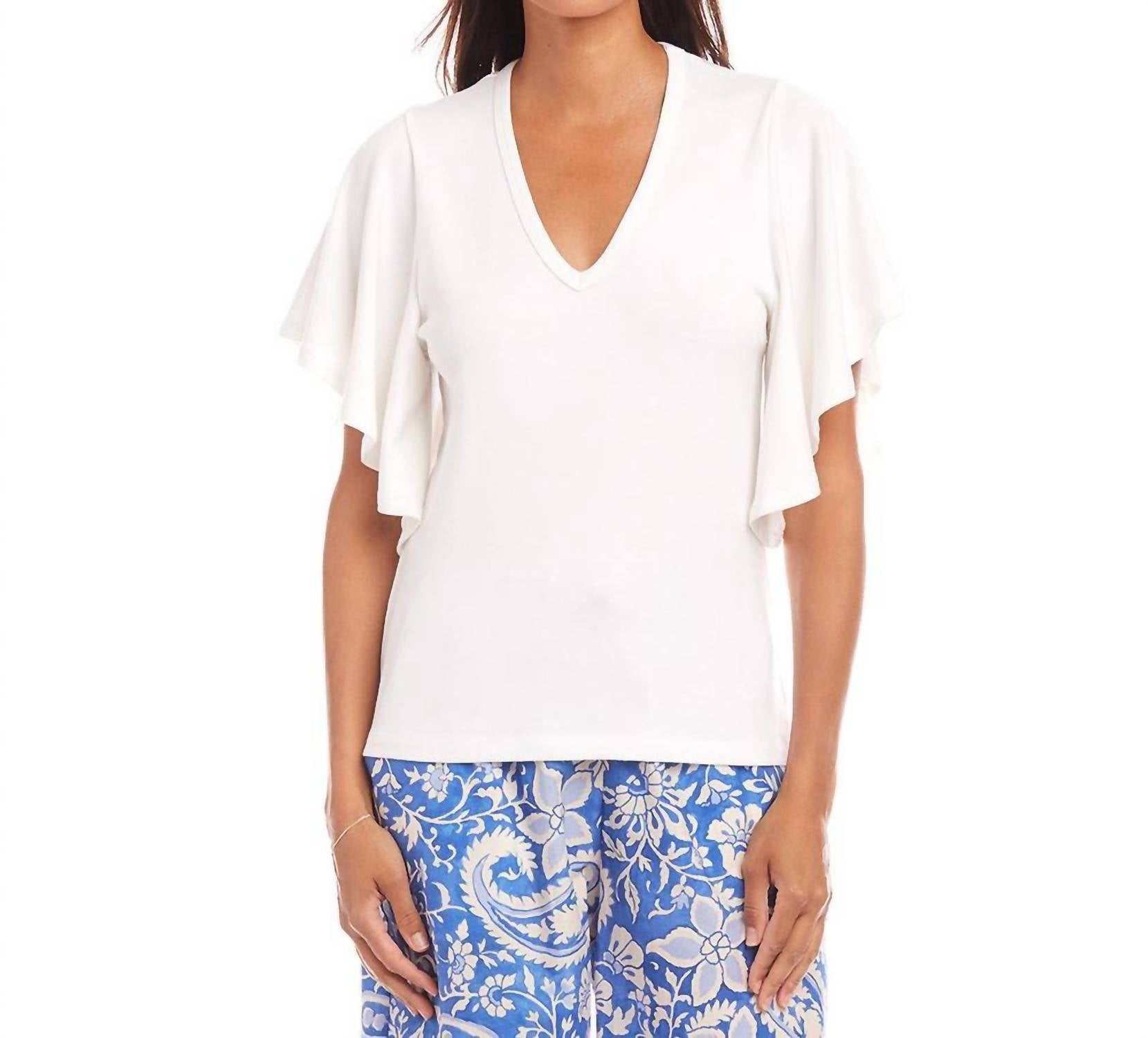 Introducing the Flutter Sleeve V-Neck Top by Karen Kane, a minimalist off-white masterpiece perfect for your next dinner party. This top features short flutter sleeves and a graceful v-neck, crafted from a blend of 58% hemp, 38% organic cotton, and 4% spandex. Measuring 23 3/4 inches in length for size M, it's made in the USA and designed to keep you cool during warmer seasons. Closure is a convenient pull-on, and for care, dry clean or machine wash cold and hang to dry.