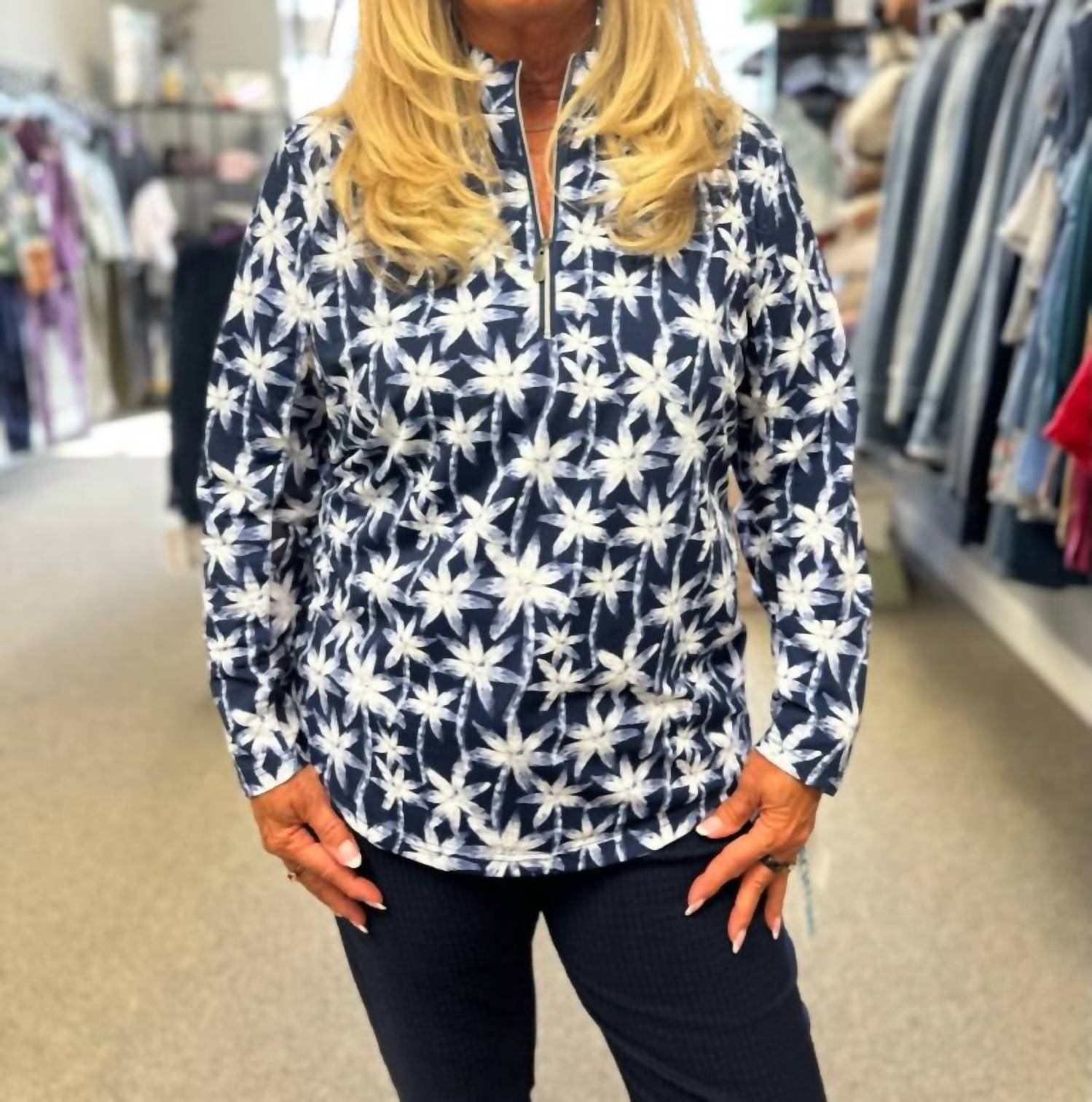 Elevate your wardrobe with the Lulu-B Bahama Print Half Zip Pullover in Turquoise Daisy, perfect for spring outings. Featuring long sleeves and a stylish mockneck, this pullover provides a cooling effect and impressive stretch. Crafted from 94% nylon and 5% spandex, it boasts UPF50+ protection. Quick to wear with its practical zip closure, it demands gentle care: hand wash and lay flat to dry.