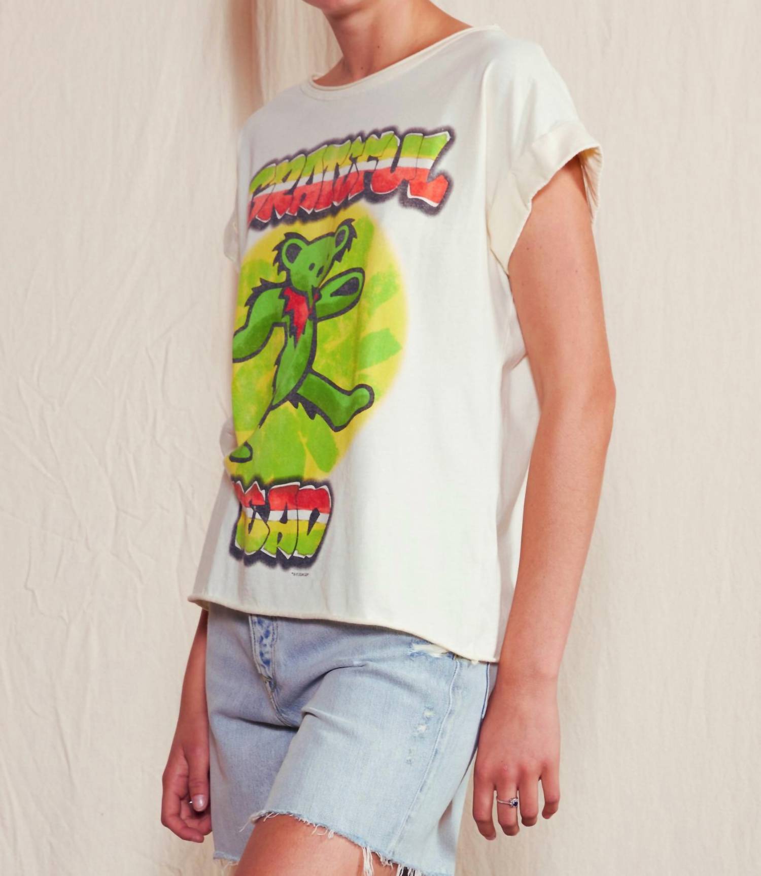 Introducing the Grateful Dead Marching Bear Top by People of Leisure, an iconic ivory tee perfect for making a statement. This women’s short sleeve t-shirt features a bold graffiti-style graphic and is crafted from 100% organic cotton for ultimate comfort. Ethically made in Los Angeles, CA, it is designed with a boatneck and a convenient pull-on closure. Easy to care for, simply machine wash and tumble dry on low. Available in sizes XS-XL.