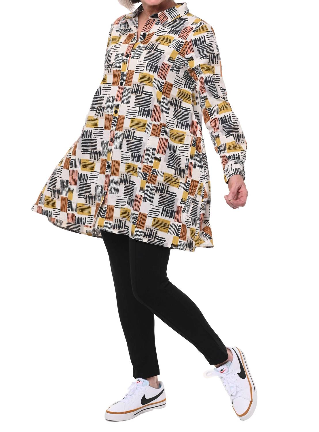 Discover the versatile charm of this tunic blouse, designed with both layering and standalone wear in mind. Its flattering silhouette and stylish details make it a closet essential. The Destin Button Down Tunic by Tulip Clothing is a stylish choice for any holiday party, with its long sleeves and crisp cotton fabric in a graphic Rhythm print. Featuring a flattering A-line design, it offers convenient front patch pockets and buttoned cuffs. Composition: 100% Cotton. Closure: Button closure. Care: Machine wash and line dry. With a garment length of 33.5 inches for size XS, this tunic combines comfort with a Boho Chic flair, making it perfect for your spring wardrobe. Center Length XS 33 1/2", S 34", M 34 1/2", L35", XL 35 1/2", XXL 36". Chest XS 40", S 42", M 44", L 46", XL 48", XXL 50".