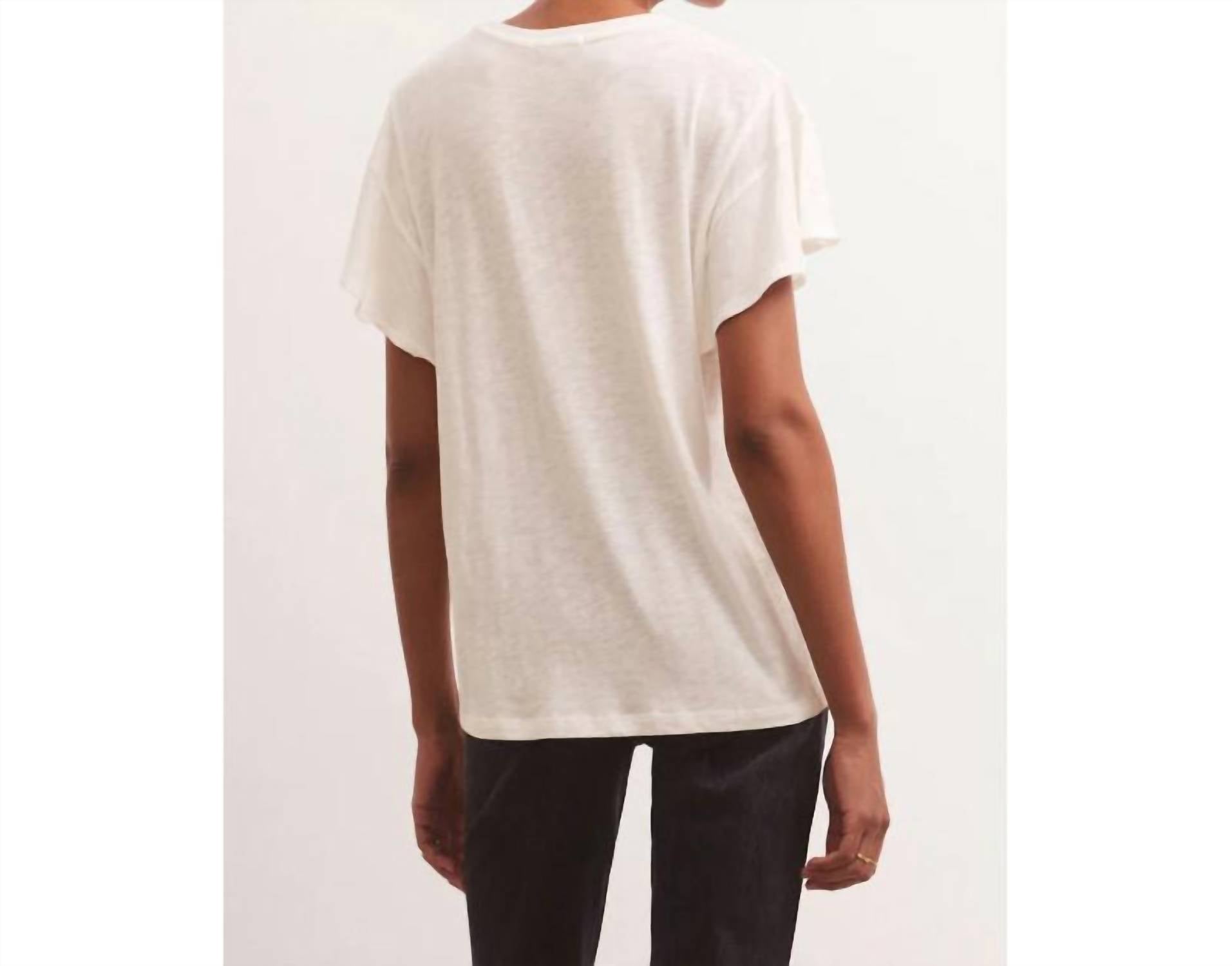 Pair this with your favorite jeans and slides for your next girls night out. This Alanis Embroidered Top is made using our soft and relaxed Slub Jersey fabric, easy crew neck top features lasercut, embroidered details at the neckline and ruffle sleeves. Semi-sheer. 55% cotton and 45% rayon.