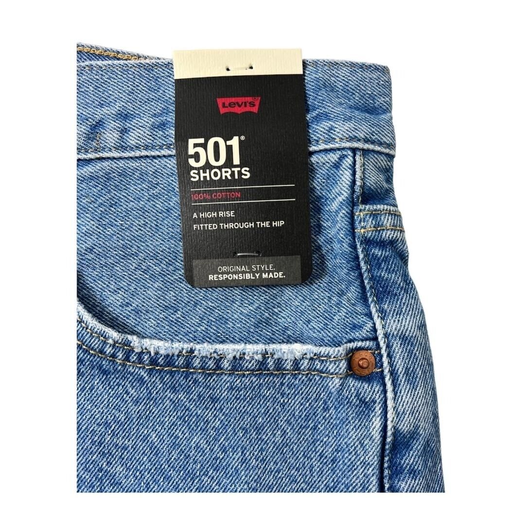 Classic Levis Branding | Stone Wash Finish | Durable Denim Material | Frayed Hem | Button Fly | 100% Cotton Fabric | Comfort Fit | Five-Pocket Styling | Mid-Rise Waist | Size 34