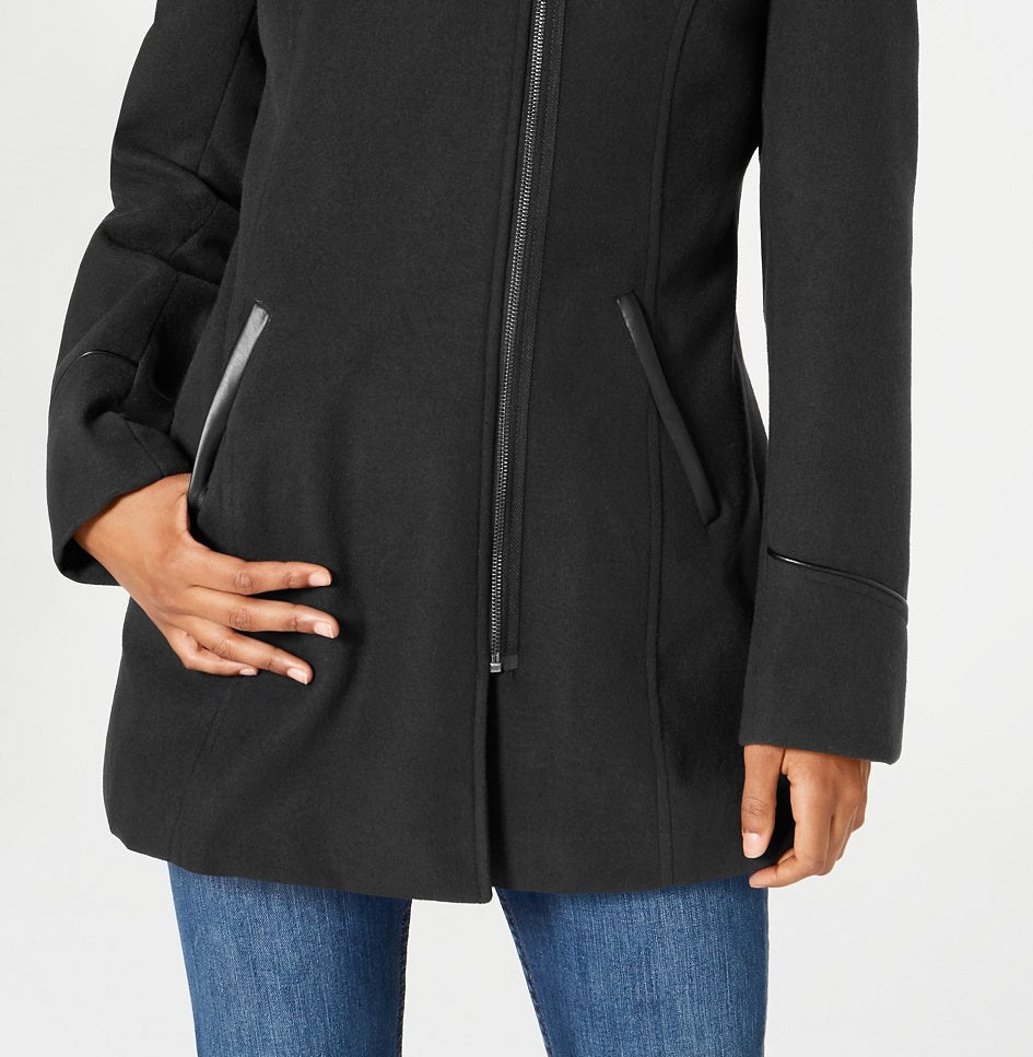 Approx. model height is 5'10" and she is wearing a size M|Approx. 30" long from center back to hem|Attached hood with attached faux-fur trim; asymmetrical front zipper closure|Faux-leather trim at sleeves and pockets|Two pockets at front|Lined|Shell: polyester/viscose/spandex; lining, faux fur: polyester; trim: polyurethane