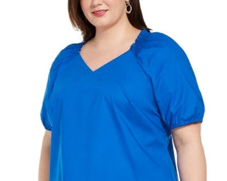 Alfani Women's Ruffled Smocked V Neck Peasant Top Blue Size 2X