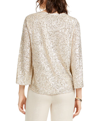 Alfani Women's Sequined Bell Sleeve Top Cocoa Butter Size Petite S