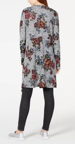 BCX Junior's Printed Rib Knit Duster Cardigan Gray floral Size X-Small
