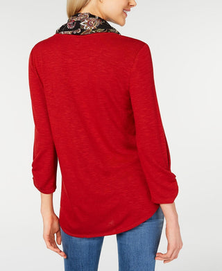 BCX Junior's Ruched Sleeve Top With Printed Scarf Brown Size Large