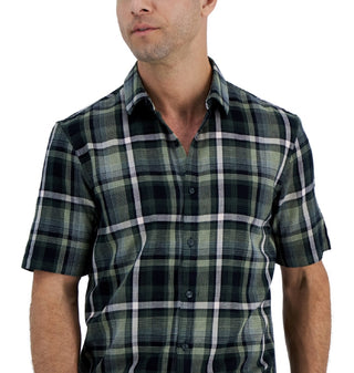 Alfani Men's Short Sleeve Panama Plaid Textured Shirt Green Size Medium