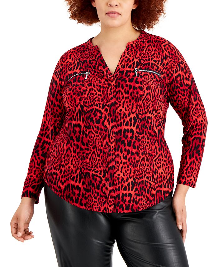 INC International Concepts Womens Zip Pocket Animal Print Shirt Red Size 2X