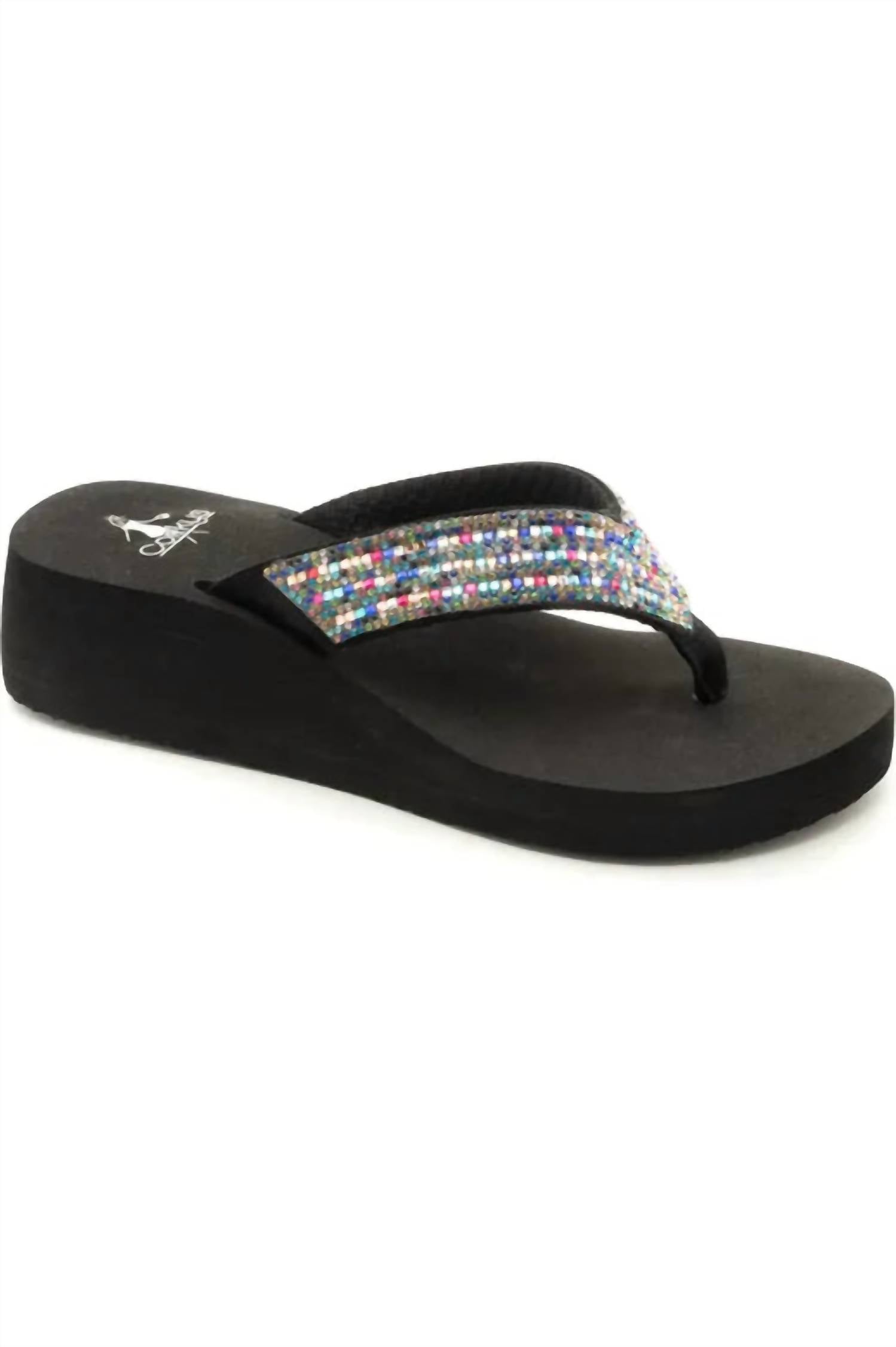 Discover the playful charm in trendy wedges showcase a jeweled upper with fabric-lined straps for a touch of sparkle. Ensures comfort with a cushioned footbed and EVA insole for support. Perfect for an effortless, stylish look. Feature an open toe. Treaded sole to keep you confidently striding in black elegance.