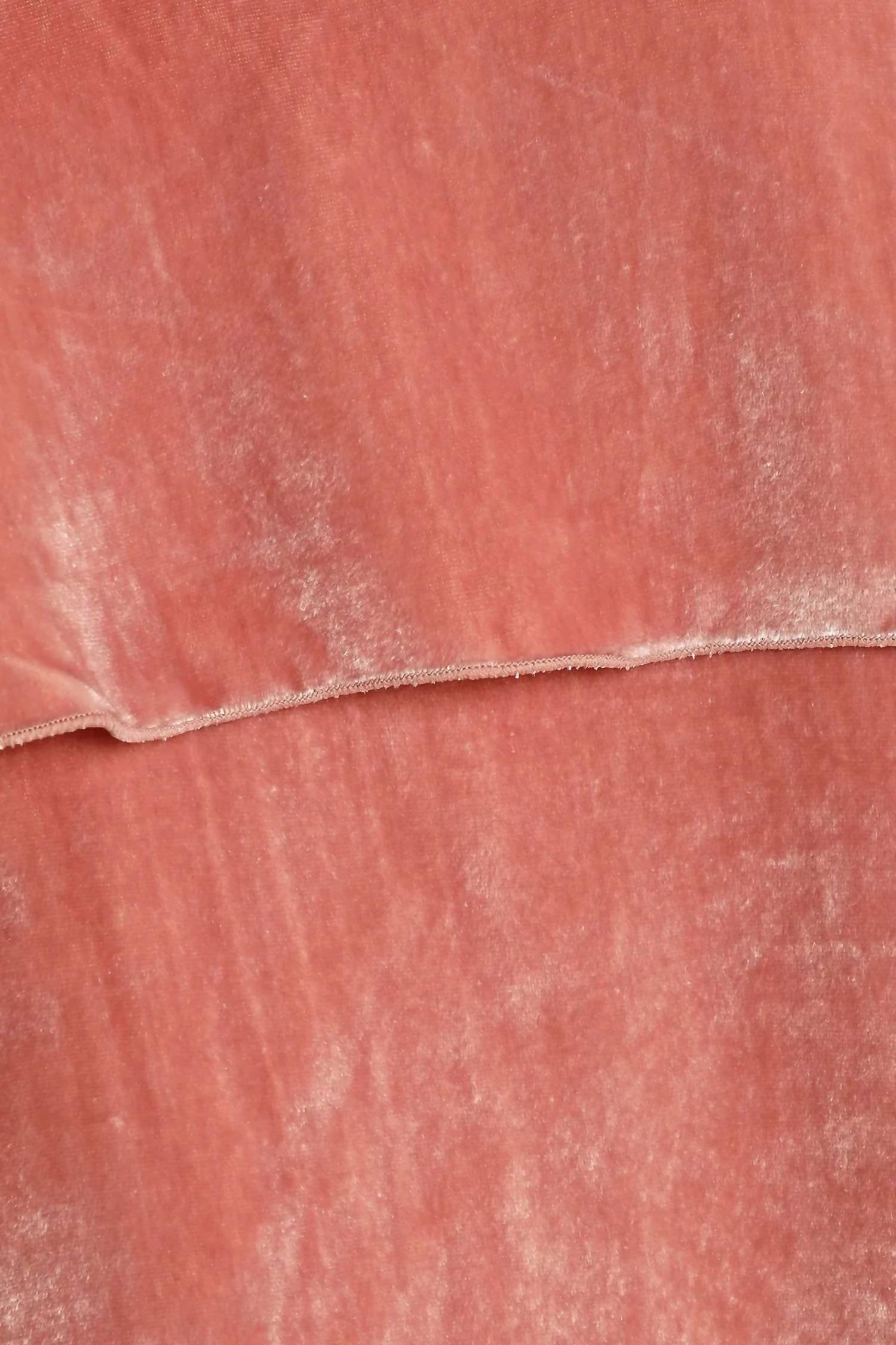 Introducing the Marybeth Velvet Ruffle Top Blouse by alice + olivia, a delicate piece in a captivating Rose Tan hue. This sleeveless beauty boasts an elegant plunging halter neckline with a spaghetti neck tie and ties that gracefully fasten behind the neck. Created from a luxurious Viscose Blend, the top features a layered upper with ruffled overlay bodice and an alluring open back. Closure is achieved with a chic tie closure, and for care, it requires dry cleaning.