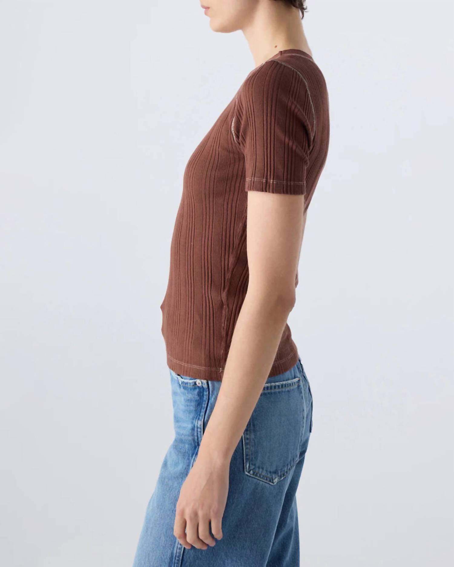 Introducing the AMO Cherish Short Sleeve Tee, an essential piece for effortless styling in a rich Cocoa hue. Made from a soft ribbed cotton blend with 94% Cotton and 6% Elastane, this tee offers a flattering fitted silhouette with subtle contrast stitching. Crafted in Portugal, its pull-on style and scoopneck make it ideal for layering. Care instructions recommend machine washing cold for maintaining its minimalist charm, perfect for travel and spring occasions.