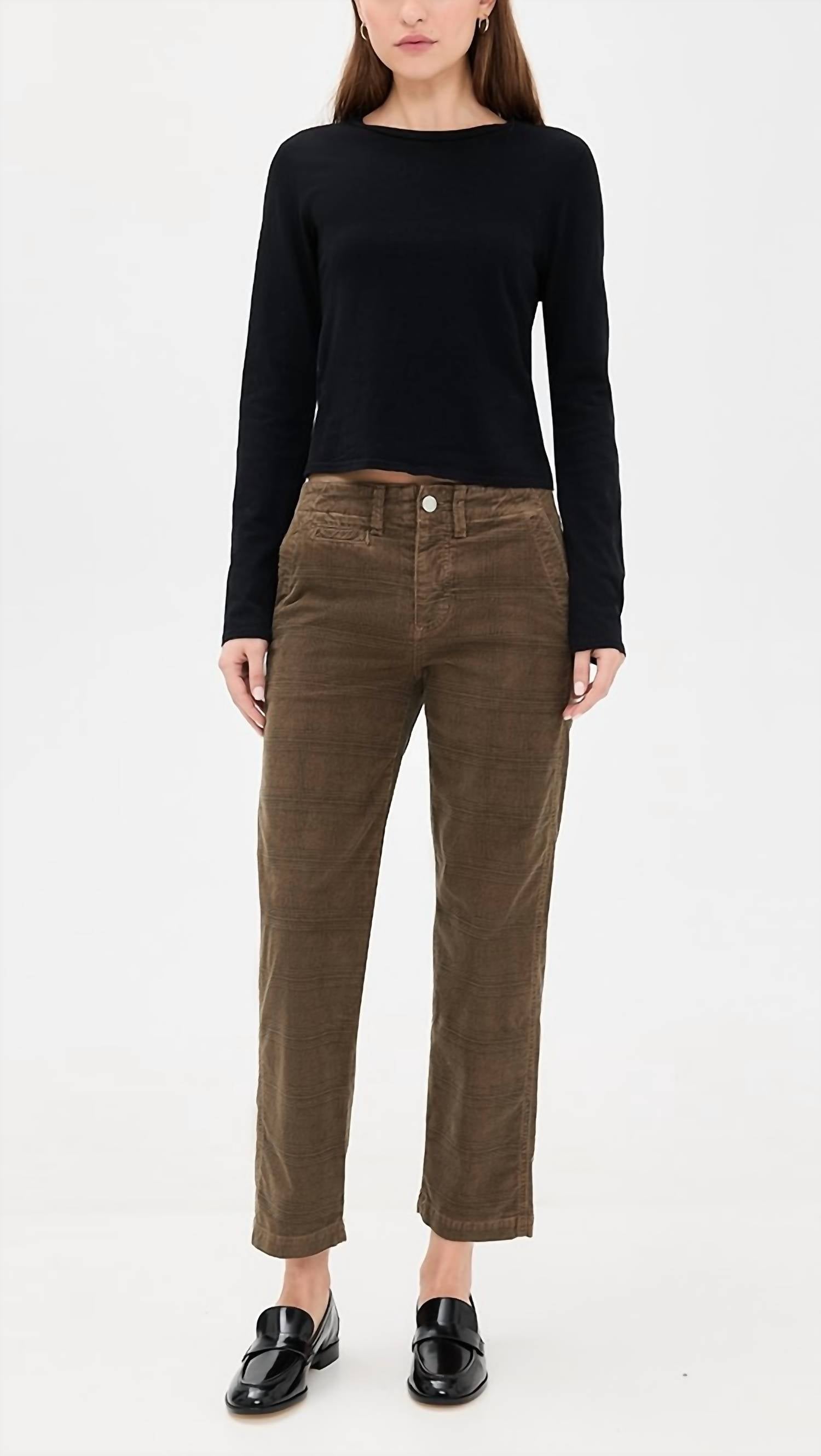 Introducing the Lillian Printed Corduroy Pant by AMO, crafted for women's fashion-forward closets. These pants are made from a mid-weight stretch corduroy in a cotton blend, featuring a plaid pattern and five-pocket styling. With a mid-rise and regular fit, they have a straight leg design and a button fly closure. Made in the USA of imported materials, care is both practical and simple: machine wash cold and tumble dry. Measurements from size 25 include a rise of 9.75 inches, an inseam of 27.25 inches, and a leg opening of 15 inches, in a chic Dark Sand hue.