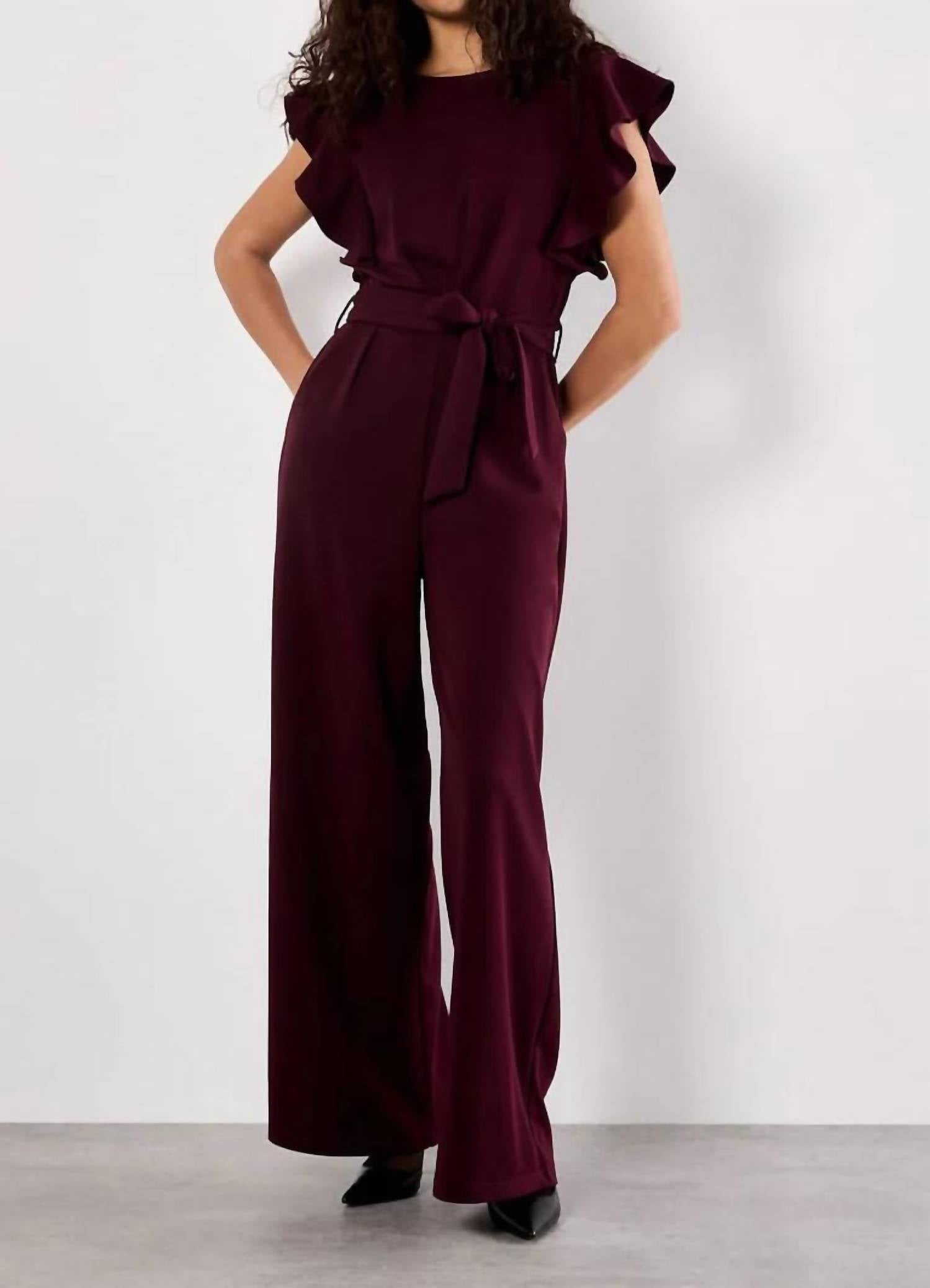 Enhance your wardrobe with the Ruffle Sleeve Jumpsuit by APRICOT—a versatile piece for your next special occasion. Crafted from jersey fabric, this jumpsuit includes stylish ruffle sleeves, a fabric belt for a flattering silhouette, and flared legs for a chic look. Composition: 97% Polyester, 3% Elastane. Closure: Zip closure. Care: Dry clean only, featuring practical side seam pockets.