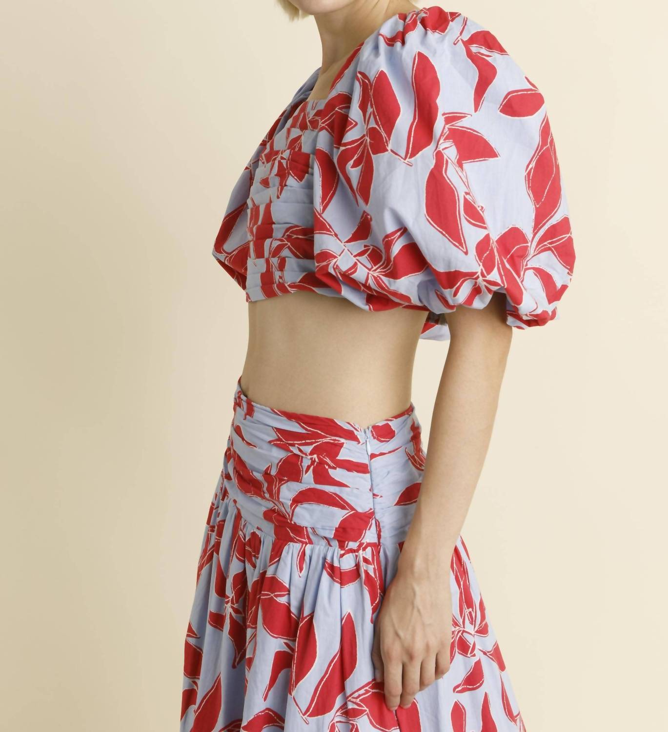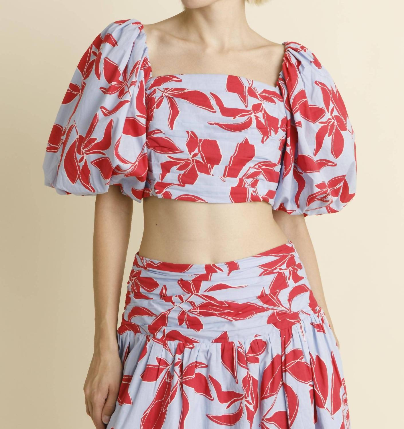 Presenting the Shirred Cropped Top by Aureum, a must-have for your vacation wardrobe in a striking blue/red floral pattern. This women's crop top features short sleeves with an elasticated bubble design and a flattering squareneck, perfect for embracing the boho chic trend. Made from non-stretch cotton poplin, this fully lined top offers comfortable breathability. Designed with an exposed zipper closure at the back, this stylish top is as easy to wear as it is fashionable. Model is 5'9" and is wearing a size Small.