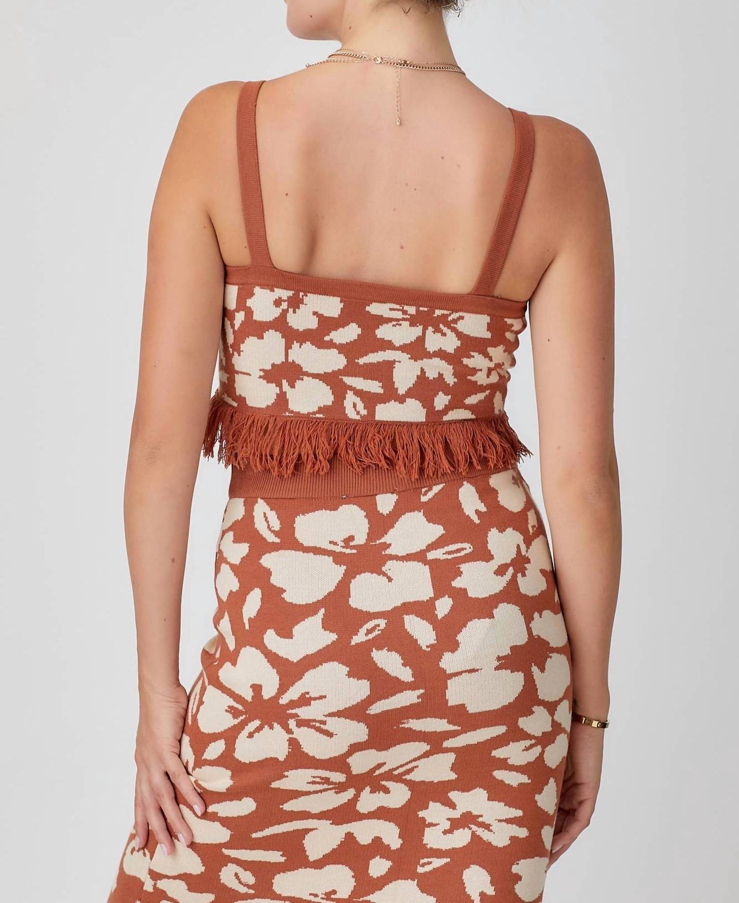 Introducing the Tulum Nights Knit Crop Top by Baevely by Wellmade, a chic addition to your wardrobe in a stunning brown hue. This sleeveless piece, featuring a scoop neckline and floral pattern, brings a touch of bohemian charm with its delicate fringe detailing. Enjoy its effortless pull-on closure, designed with vacation and boho chic trends in mind. Perfect for summer, this versatile top pairs beautifully with the matching skirt for any occasion.