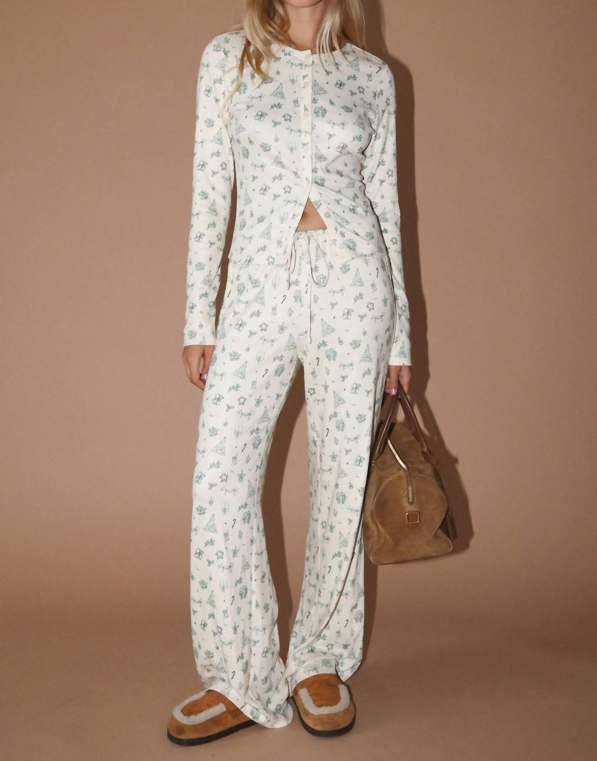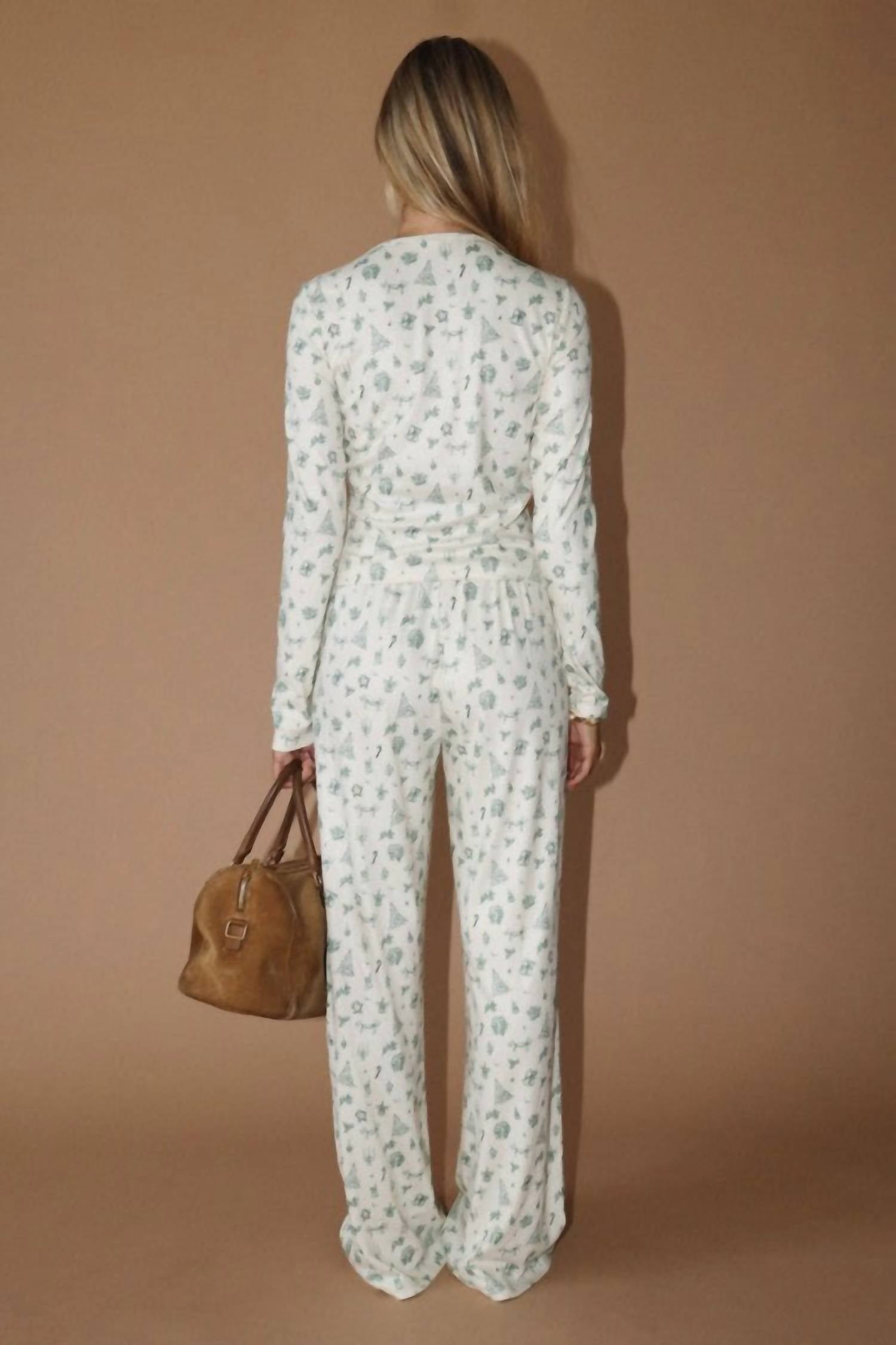 Embrace the festive spirit with the Christmas Lounge Pant by Bailey Rose, perfect for cozy holiday gatherings. These cream wide-leg pants showcase a charming dark green Christmas tree print and feature a comfy pull-on closure with a drawstring waist for a comfort fit. Made from a soft blend of 94% polyester and 6% spandex, they're ideal for lounging all day during winter seasons. Care is a breeze with machine wash and tumble dry options.