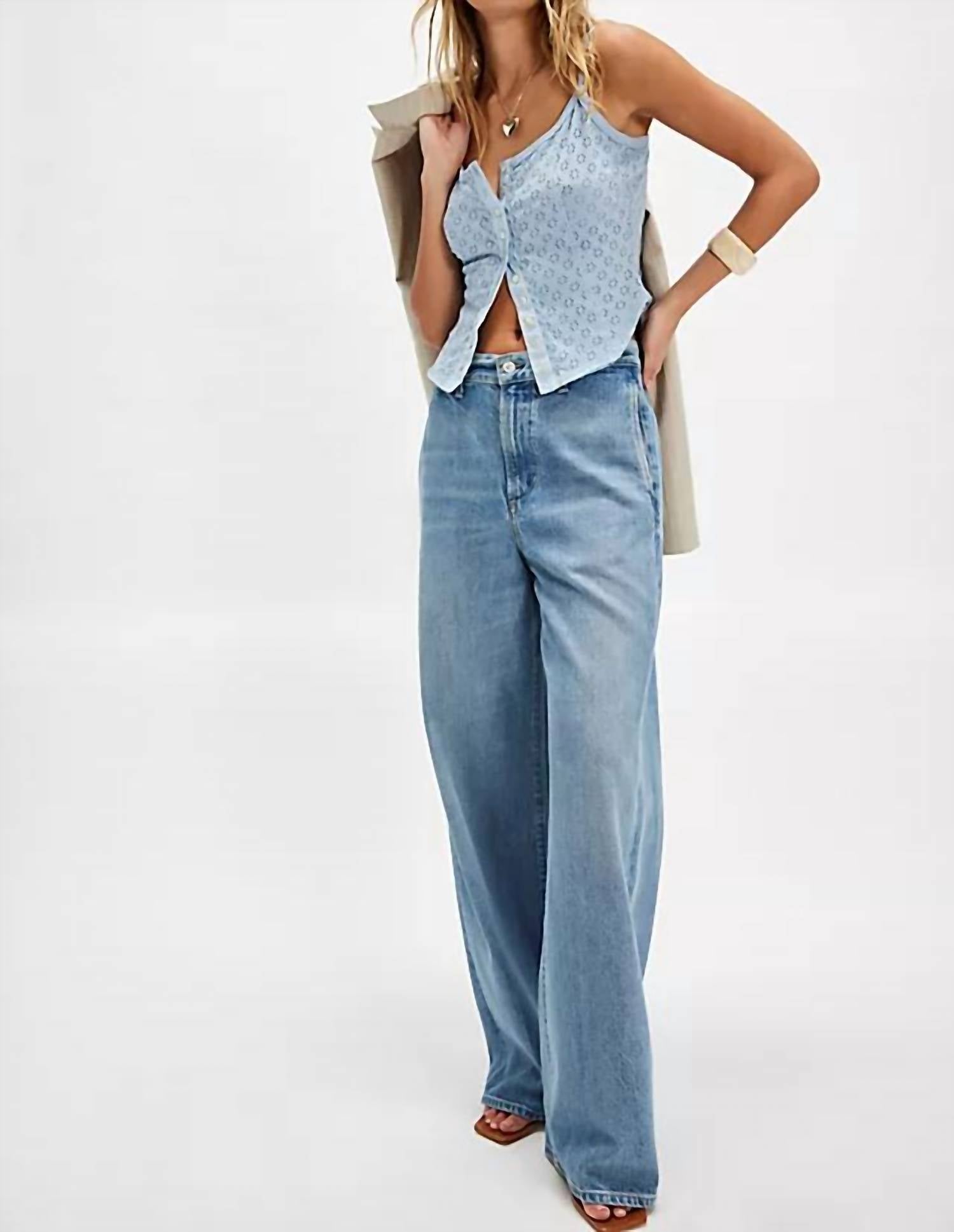 Embrace timeless style with the Ayla Polish Trouser Jeans by Citizens of Humanity, crafted in a chic Chalice color. These jeans feature a mid-rise and relaxed wide-leg silhouette, made from a blend of 30% PCR cotton and 70% Lyocell, offering both comfort and sustainability. Designed with a zip fly and button closure, they sport a four-pocket design in a soft, solid-based, light-wash denim, echoing '90s fashion. Proudly imported, they require easy care with machine washing and tumble drying, making them a versatile choice for a spring dinner party or a casual Easter outing.
