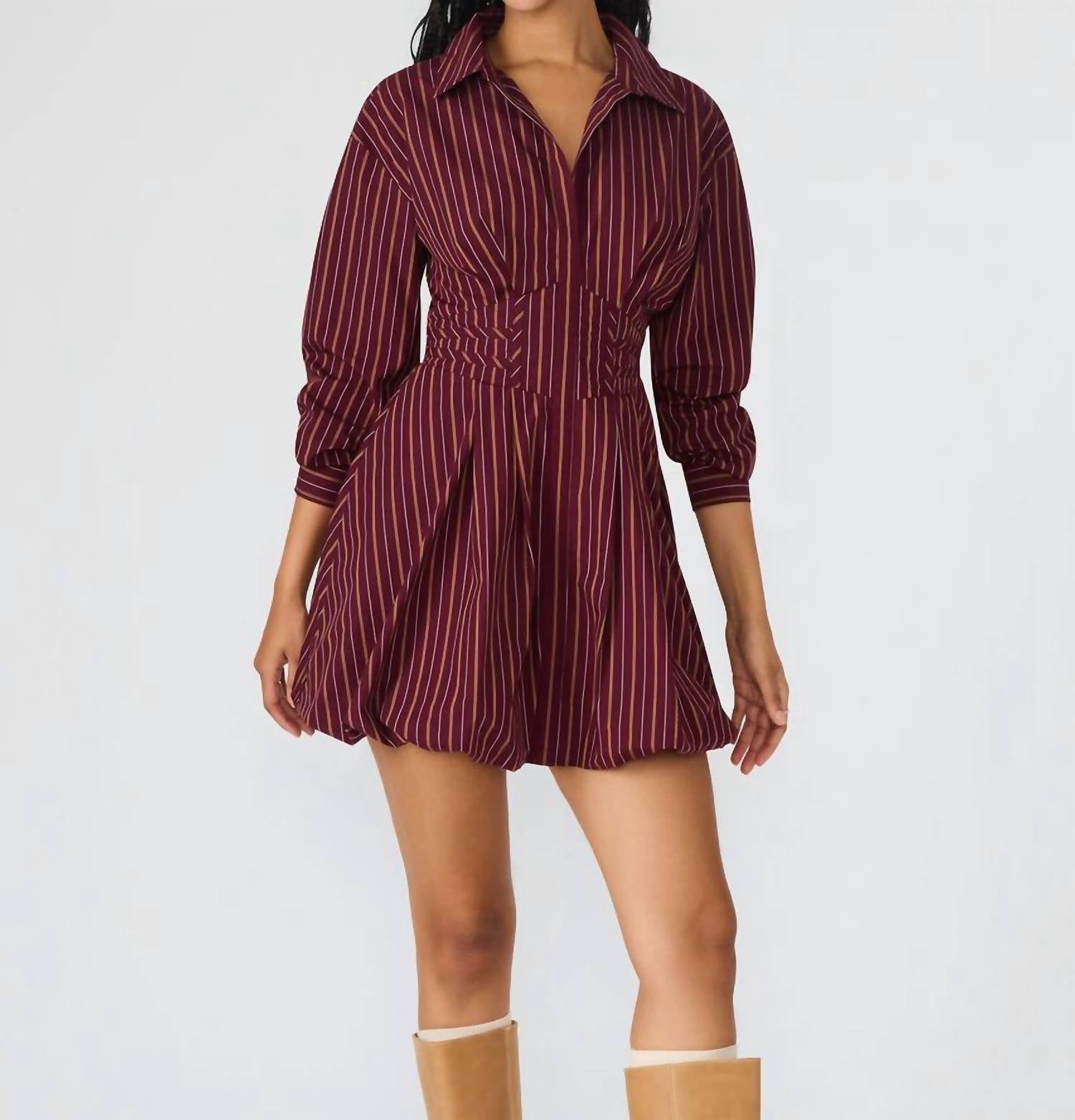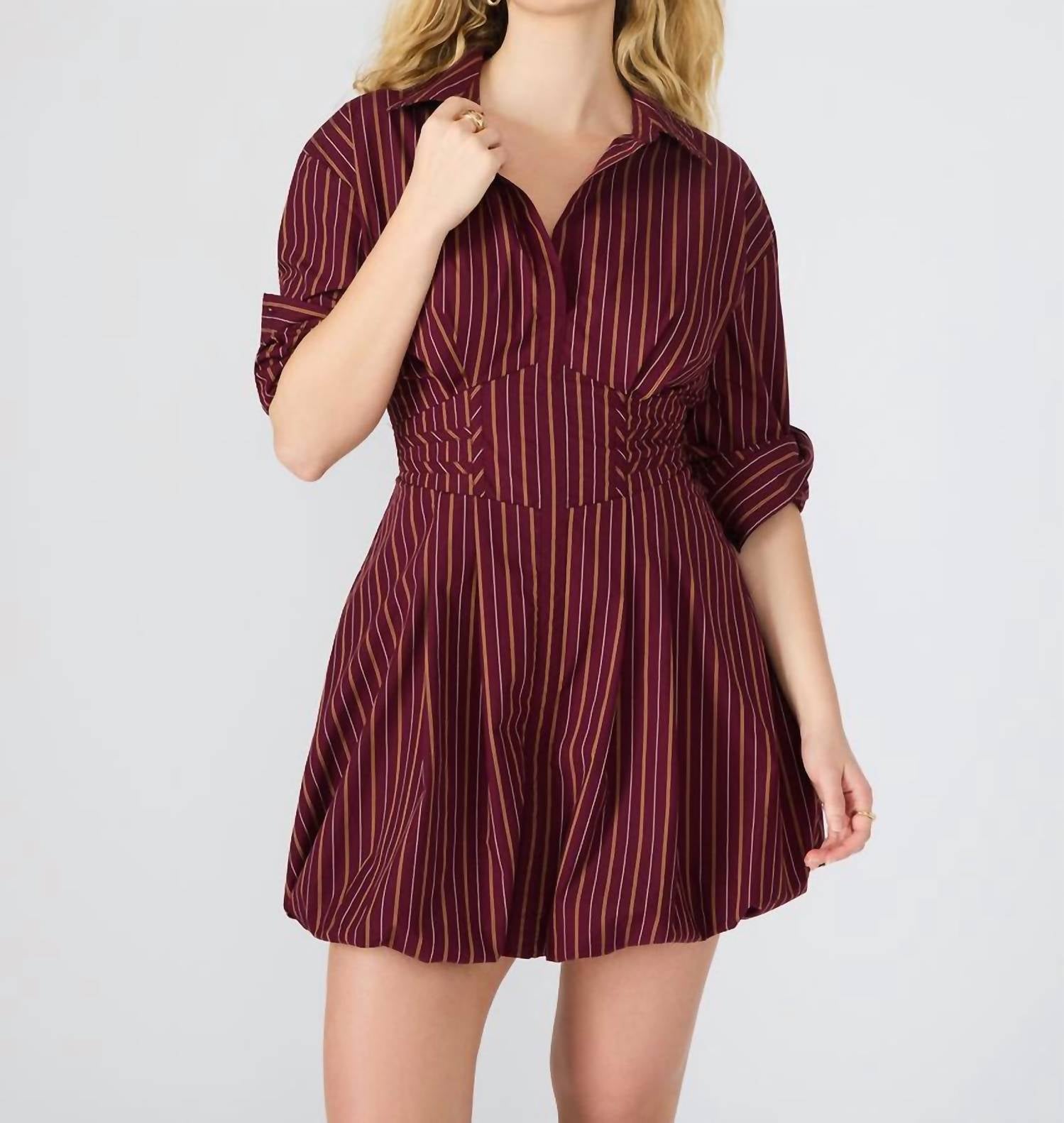 Introducing the Arielle Mini Dress by Steve Madden, an elegant choice in a rich wine hue. This piece features long sleeves and a collared neckline, offering a classic A-line silhouette with a playful bubble skirt bottom. Crafted from 70% cotton, 27% nylon, and 3% spandex, it allows for a comfortable fit and pull-on closure. Care instructions recommend machine wash and tumble dry, ensuring easy maintenance. Shown in size 2.