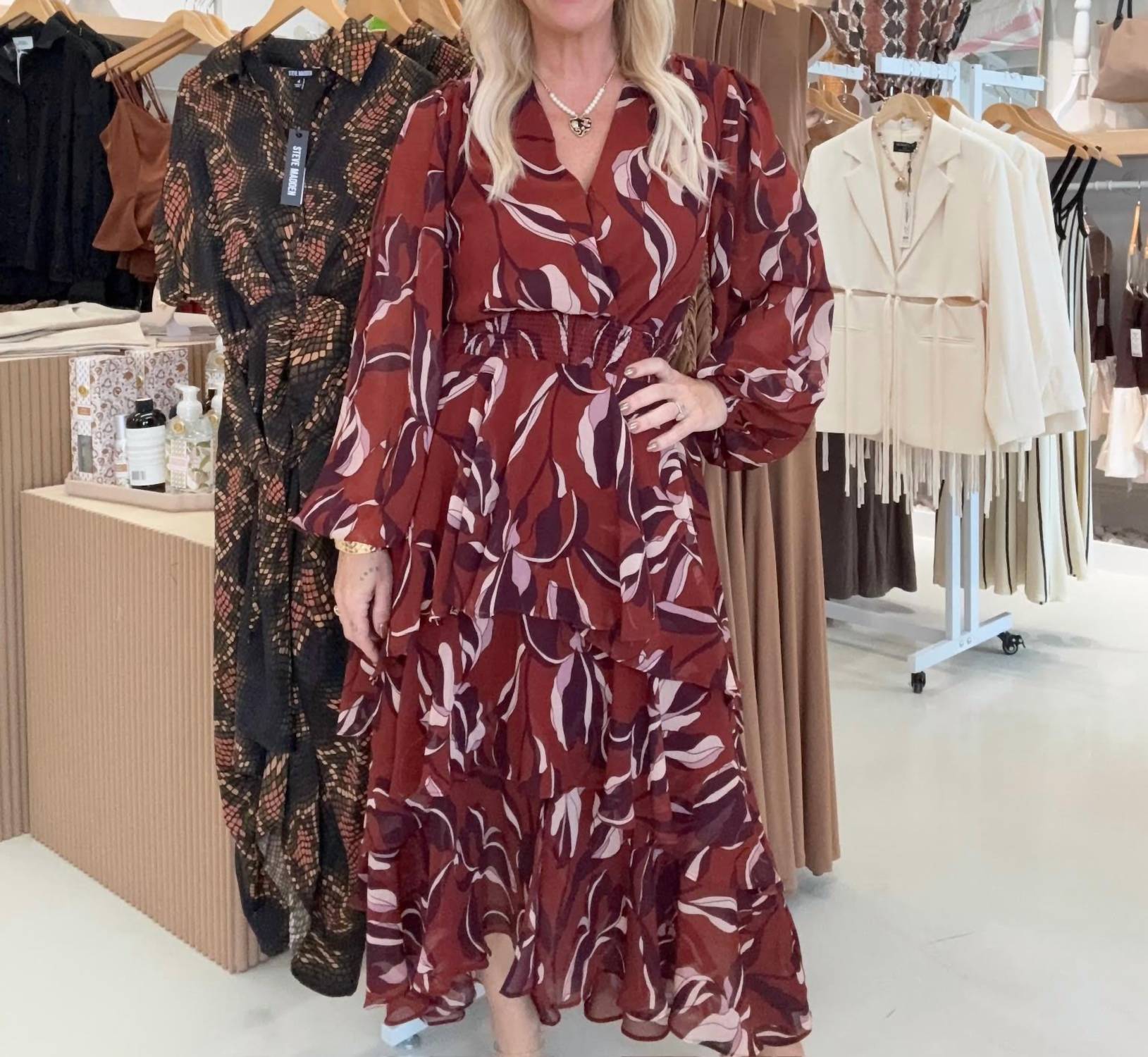Just add slides or mules and you are good to go. Step out in style with the Bei Dress Duberry by Steve Madden, where boho chic meets contemporary elegance. This women's midi dress features long sleeves and a flattering A-line silhouette, crafted from premium polyester for a luxurious feel. The patterned Duberry design, complemented by a V-neckline, makes it perfect for summer holiday parties. Care is a breeze with machine wash instructions, ensuring you can enjoy this sophisticated piece with ease.