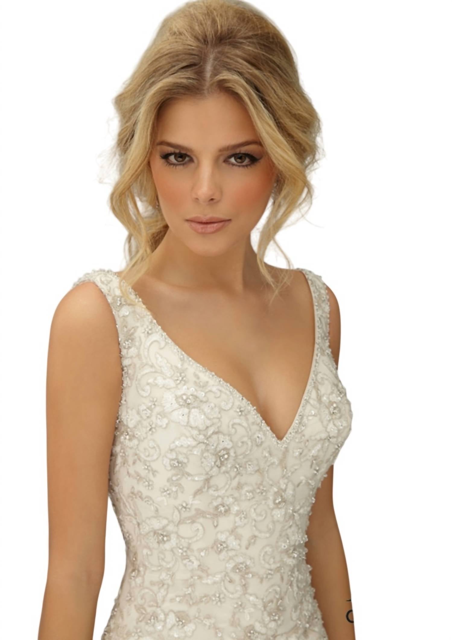 Embrace timeless elegance with the Trump All Over Bead Dress by Angelina Faccenda, a captivating choice in ivory for any wedding setting. This sleeveless masterpiece showcases exquisite lace and hand-woven embroidery crafted with silk thread, beautifully designed for a flattering fit. Closure: Button closure. Approximate Measurements: 38" bust, 29.5" waist, 41.5" hips, and 61" hollow to hem. Perfect for spring occasions, this solid-patterned dress features a classic V-neckline that accentuates its romantic style.