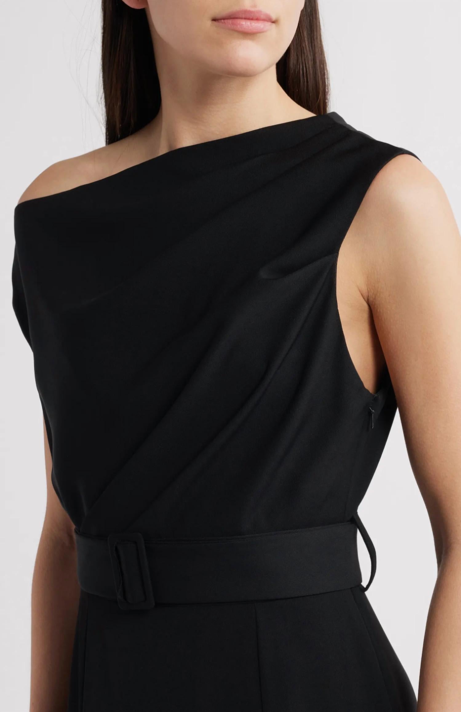 The Black Halo Caprina Gown embodies sophisticated elegance with its one-shoulder design and graceful A-line silhouette. A single cap sleeve complements the 62" length of this striking gown, crafted in the USA from 100% polyamide. The hidden side-zip closure and a removable belt add practicality and style, perfect for a dinner party or Thanksgiving celebration. To maintain its pristine condition, this gown requires dry cleaning.