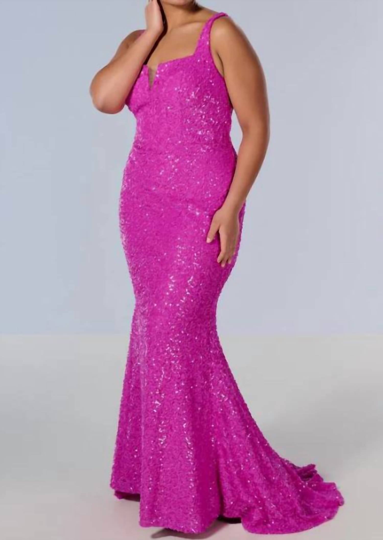 This formal gown is constructed with a fit-and-flare silhouette, designed to be fitted through the body before widening at the knees. The exterior is fully covered in sequins, creating a textured and light-reflective surface. It features a notched neckline supported by slim shoulder straps and a V-cut back. The skirt is engineered with a court-length train that extends behind the wearer, while the hem is reinforced to maintain its flared shape. This piece utilizes a zip closure for a secure fit, balancing a structured bodice with a wide, flowing base for easier movement.