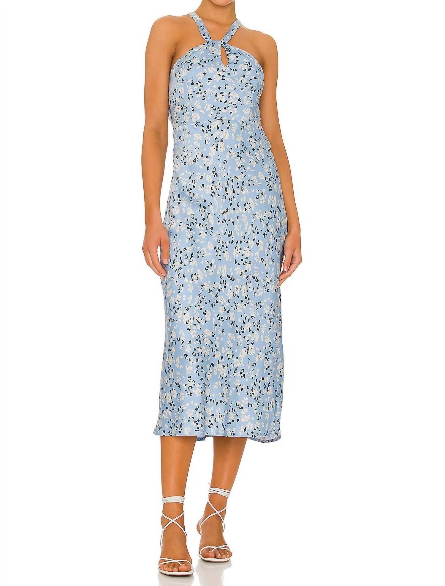A midi dress so versatile, your options for wearing it are endless. Introducing the Sandrine Dress by ASTR, a charming addition to your summer vacation wardrobe. This women's sheath dress features a sleeveless, halter neckline in a captivating blue floral pattern, and it's designed for a relaxed, yet polished, look. Material: Rayon. Closure: Tie closure. Care: Dry clean only. Perfect for embracing the maximalist trend with timeless elegance.