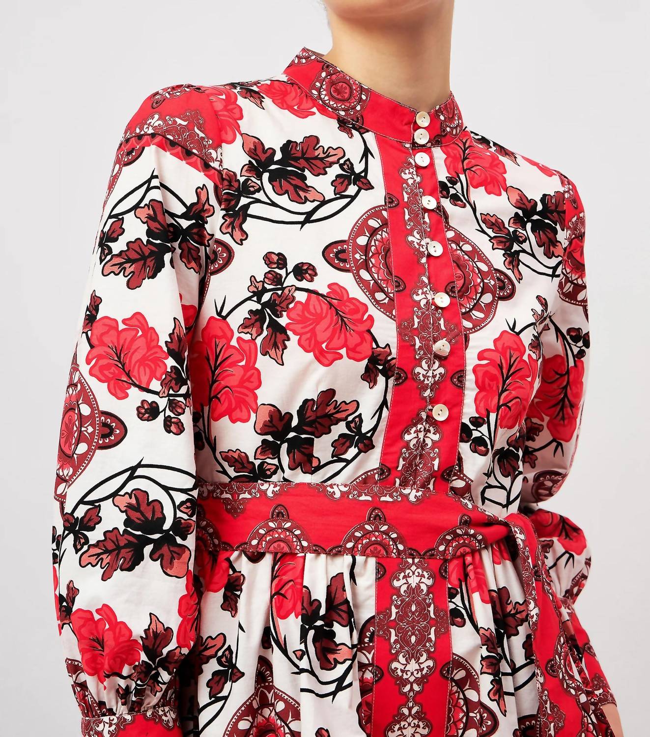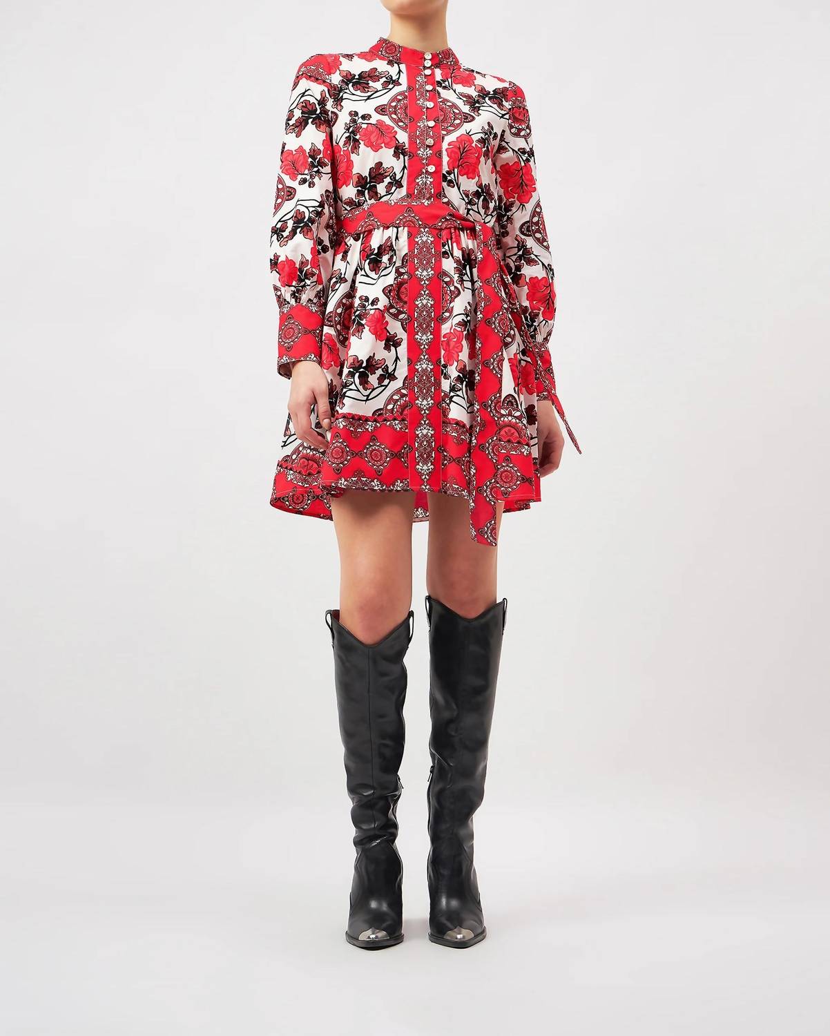 Introducing the Nella Mini Dress by BEYOND by Vera, an elegant addition to your wardrobe with its romantic Atlas Crimson pattern inspired by Morocco's breathtaking mountain landscapes. This fit and flare dress features long sleeves with smocked cuffs and a mockneck adorned with pleats on the collar, skirt, and bodice. Crafted from 100% cotton, it is designed with button closure for added style. Easy to maintain, simply machine wash on a gentle cycle using cold water and mild detergent, then line dry.
