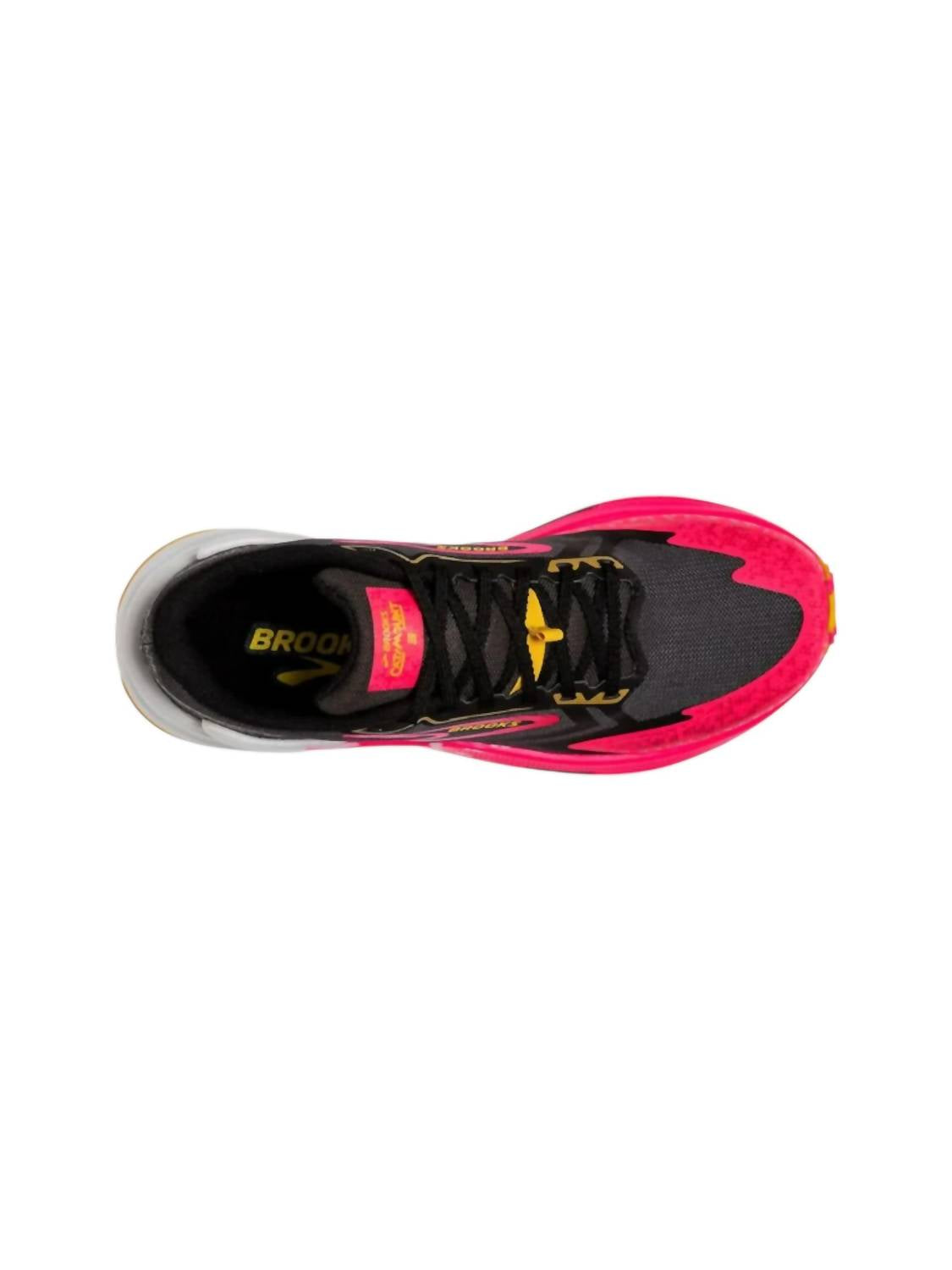 Introducing the Women's Catamount 3 Shoes by BROOKS in a striking Black, Diva Pink, and Lemon Chrome colorway, tailored for the adventurous athlete. These athletic shoes are crafted with premium, single-layer TPEE mesh uppers, ensuring lightweight breathability and durability on rugged trails. The nitrogen-infused DNA Flash midsole technology offers an optimal balance of responsiveness and cushioning, complemented by SkyVault propulsion plates for an energetic push. TrailTack Green rubber outsoles, composed of 25% recycled content, provide exceptional traction, supported by sustainable materials equivalent to 7 plastic water bottles.