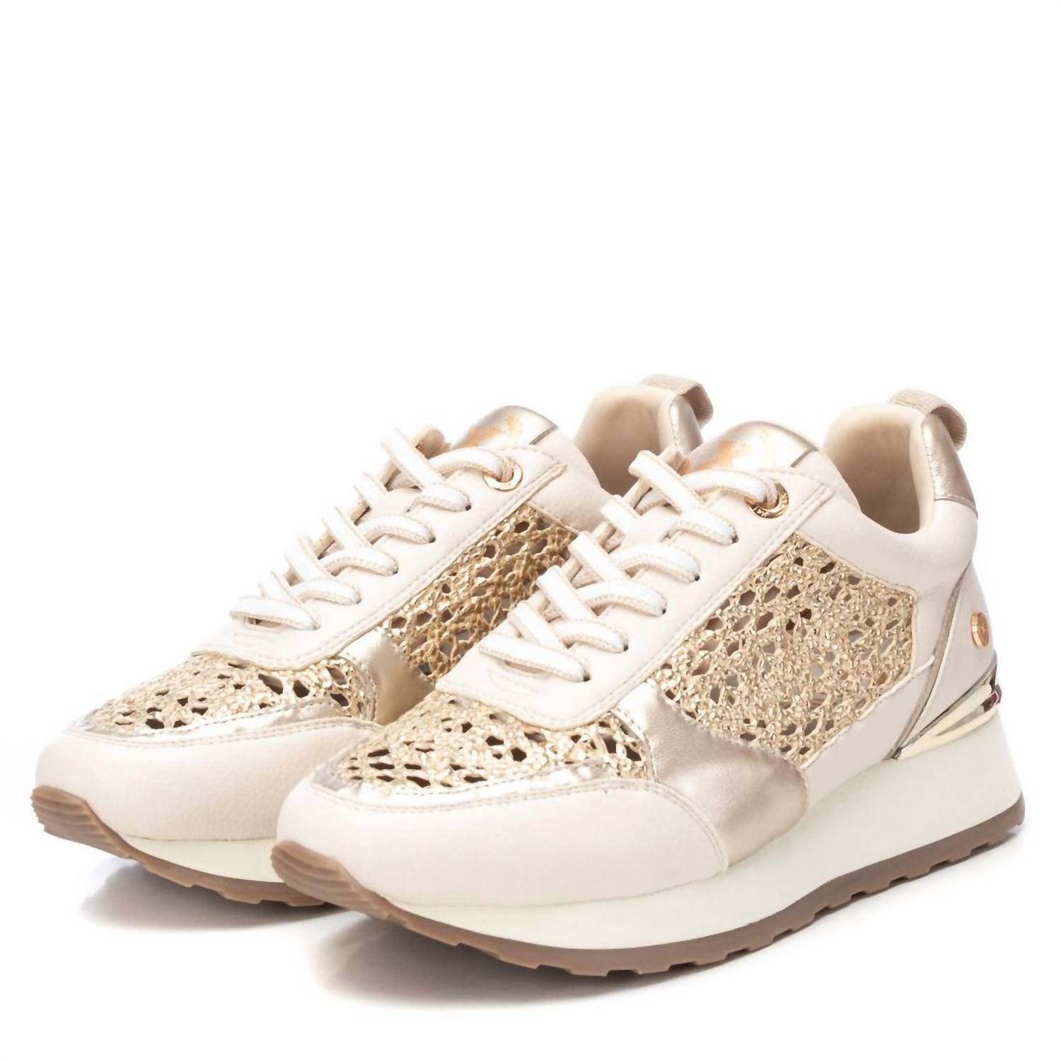 When fashion and function come together seamlessly. Elevate your everyday style with the Women's Trainer Sneakers by Xti, crafted in a chic faux leather. These sneakers combine a lace-up closure with metallic and raffia details, adding a sophisticated touch to your casual outfits. Designed with a low wedge heel and a round toe shape, they ensure comfort without compromising elegance. Featuring a non-slip sole with a metallic heel accent, these sneakers are perfect for both running errands and social outings.
