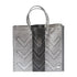 Introducing the Women's Handmade Tote Bag by Lola's Bag, an exquisite piece crafted by native artisans from the Southeast of Mexico. This medium-size black and silver chevron-patterned tote, measuring approximately 12.59 inches in height, 4.72 inches in width, and 13 inches in depth, features a unique design embellished with a Sterling Silver Plated Signature Medallion and Lola's brand logo plate. Made from durable waterproof plastic with braided top handles, it is designed to be both lightweight and sturdy, perfect for carrying your essentials. Origin: 100% Handmade in Mexico. Care: Hand washable.