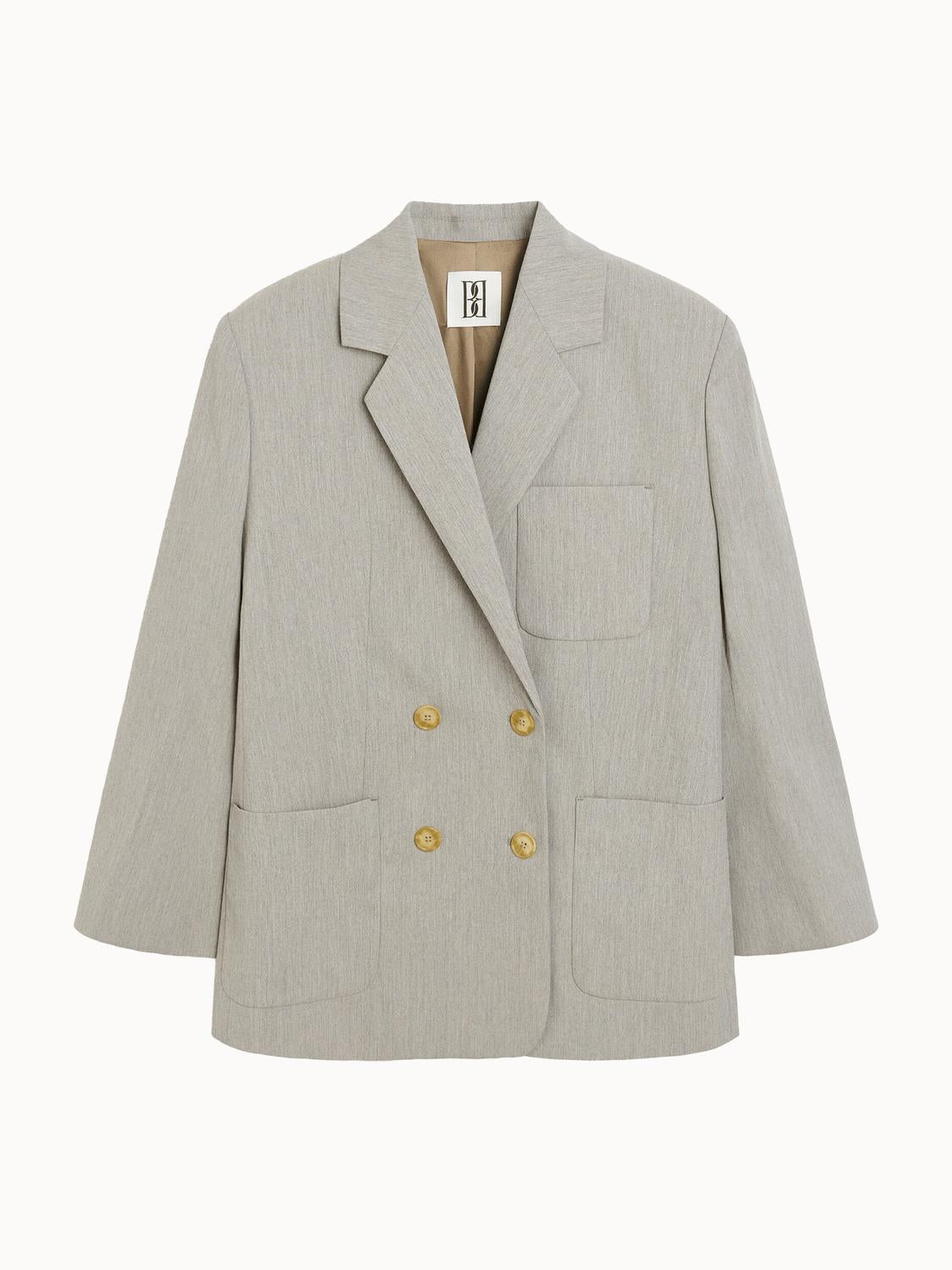 An elevated version of your favorite classic blazer. Introducing the Railey Double-Breasted Blazer by BY MALENE BIRGER, a sophisticated addition to your wardrobe in elegant Grey Brown Melange. This blazer features long sleeves, a notch lapel collar, and practical inside and front pockets for convenience. Crafted from 69% recycled polyester, 30% viscose, and 1% elastane, the blazer offers a luxurious feel and a loose fit. Dry clean only.